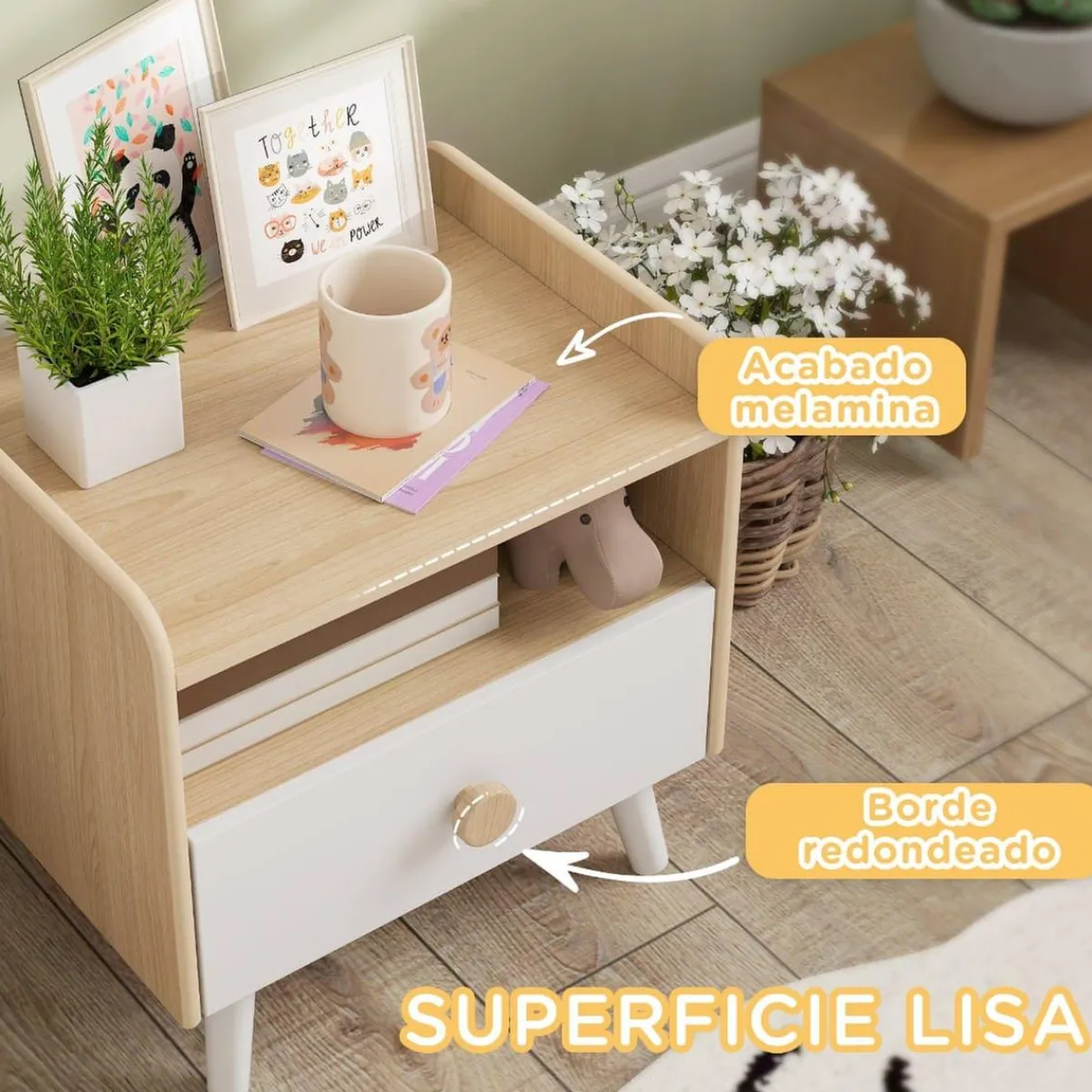 - Mesita de noche infantil, con un compartimento abierto y un cajón