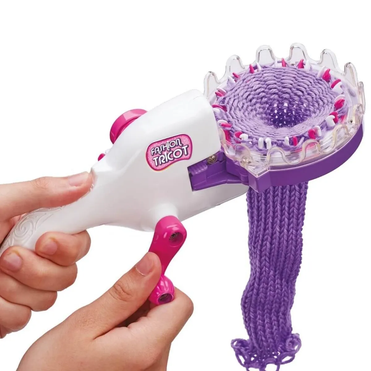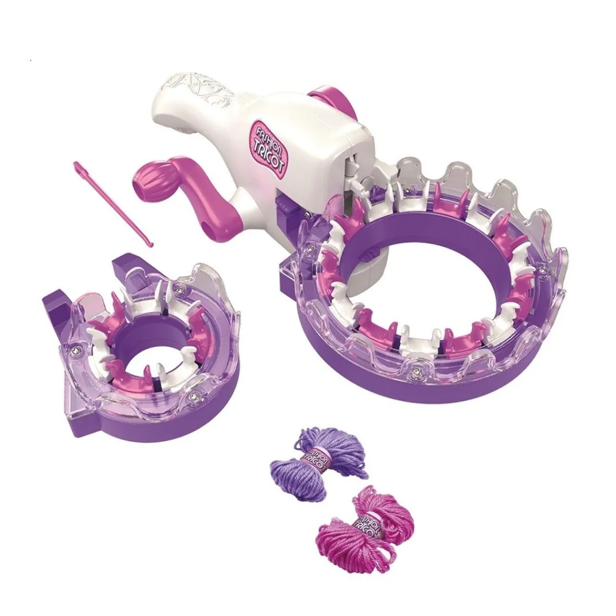 Elige el tamaño del anillo y la lana, cárgalos en la máquina y gira la manilla.