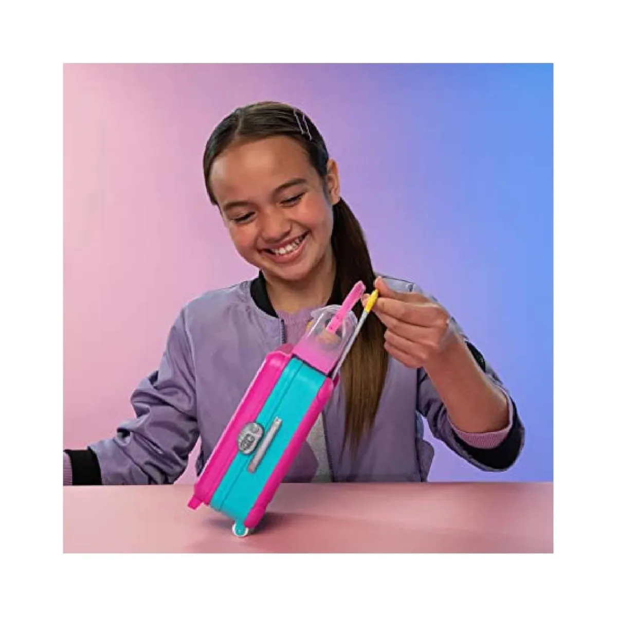 La maleta con ruedas incluye 10 mini sorpresas dentro, con todos los accesorios que tu mascota necesita para irse de viaje.