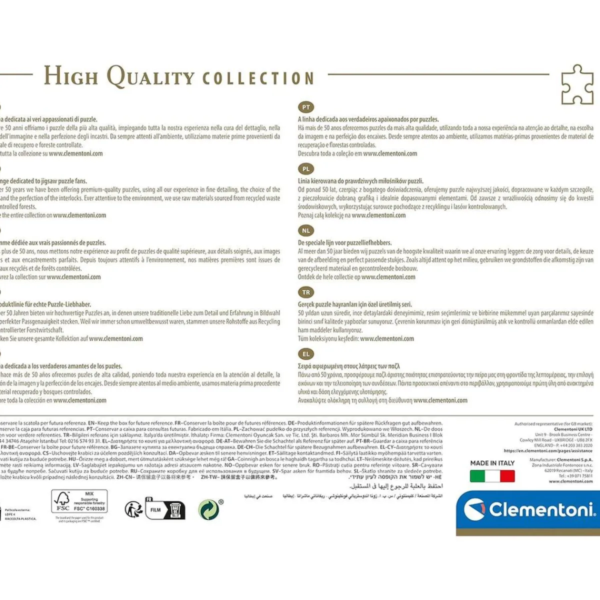 Sensibles a los problemas medioambientales, todos los puzzles Clementoni están fabricados con materiales reciclables. Así que, además de pasar un buen rato, estarás contribuyendo a cuidar nuestro planeta.