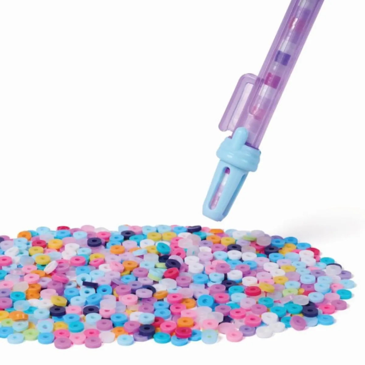El kit incluye más de 1.200 cuentas Heishi de colores, 10 cuentas especiales, un bolígrafo de cuentas fácil de usar, una guía de medición para ajustar el tamaño de la muñeca y un taller de pulseras con cierre automático. Gracias a su diseño innovador, las pulseras se ensamblan sin necesidad de nudos ni ganchos, simplemente apilando, enhebrando y presionando el botón para cerrarlas mágicamente.
