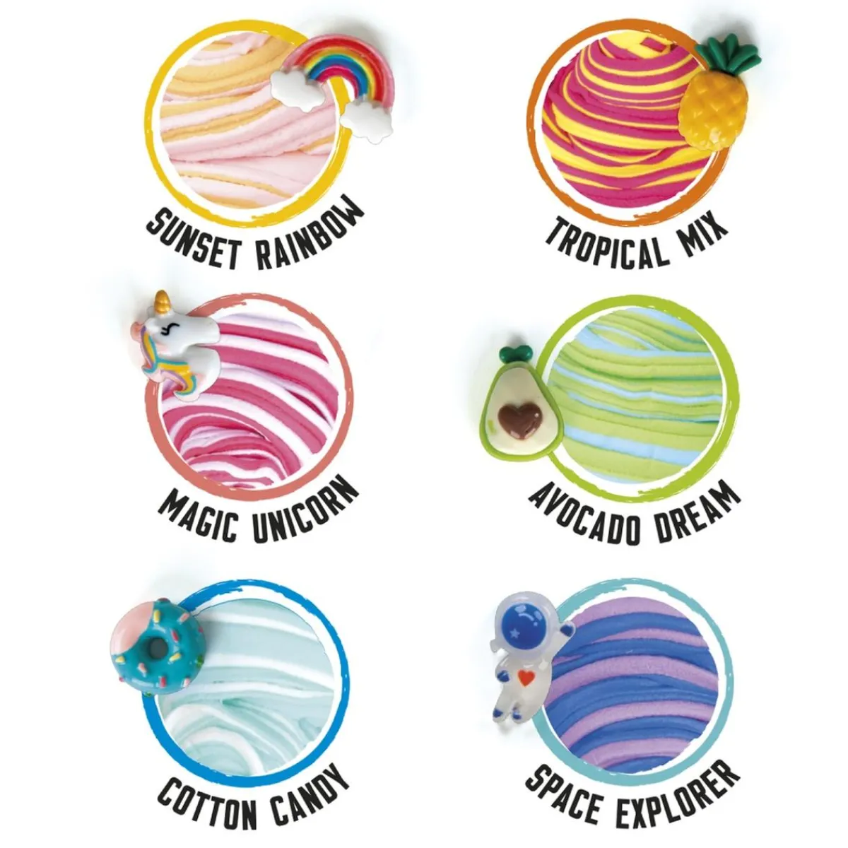 Cada bote contiene 2 colores, 2 decoraciones coordinadas con los colores de la pasta y un charm especial para enriquecer tus creaciones. Hay 6 variantes brillantes disponibles, cada una con sus decoraciones y charm únicos. ¡Colecciónalos todos! (Se venden por separado).
