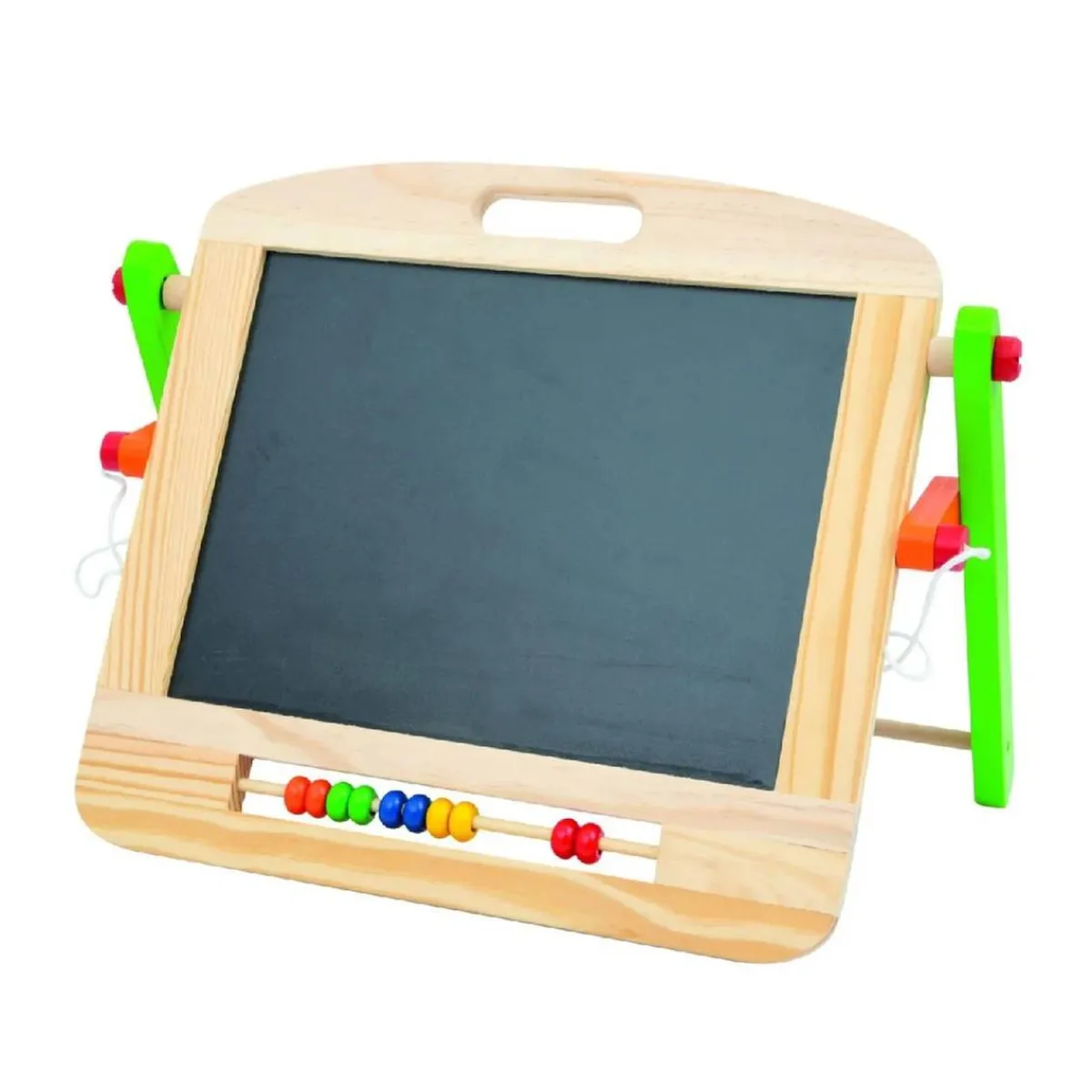 Esta pizarra de madera tiene dos lados: uno negro para dibujar con tiza y una superficie blanca magnética para pegar y jugar con formas de colores.
