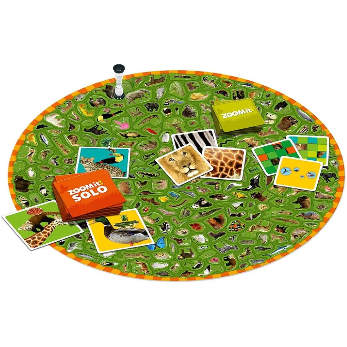 Contiene: 1 tablero con 250 animales, 180 cartas Zoom It Y 40 cartas Zoom It SOLO, reloj de 60 segundos e instrucciones.