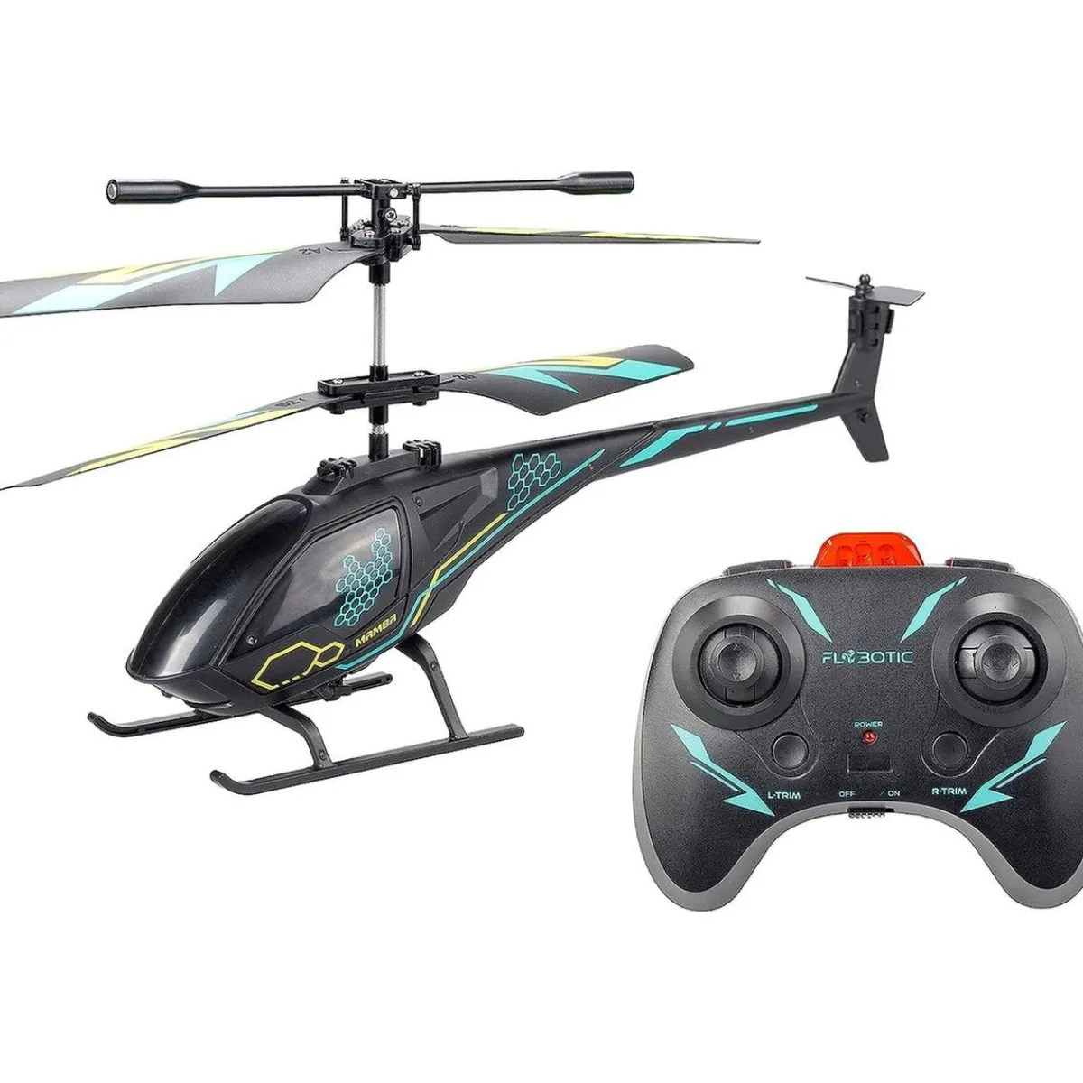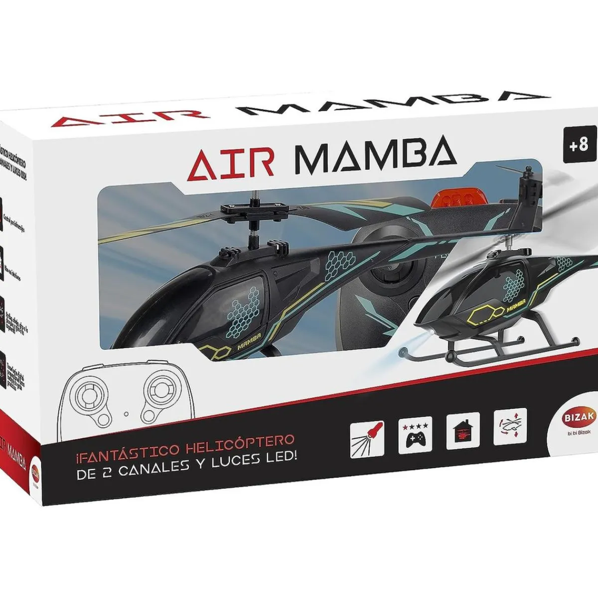 El diseño de este genial juguete te sorprenderá. Está decorado con gráficos que simulan la piel de una temible serpiente, la Mamba Negra. ¡Te sentirás como un verdadero explorador con este helicóptero!