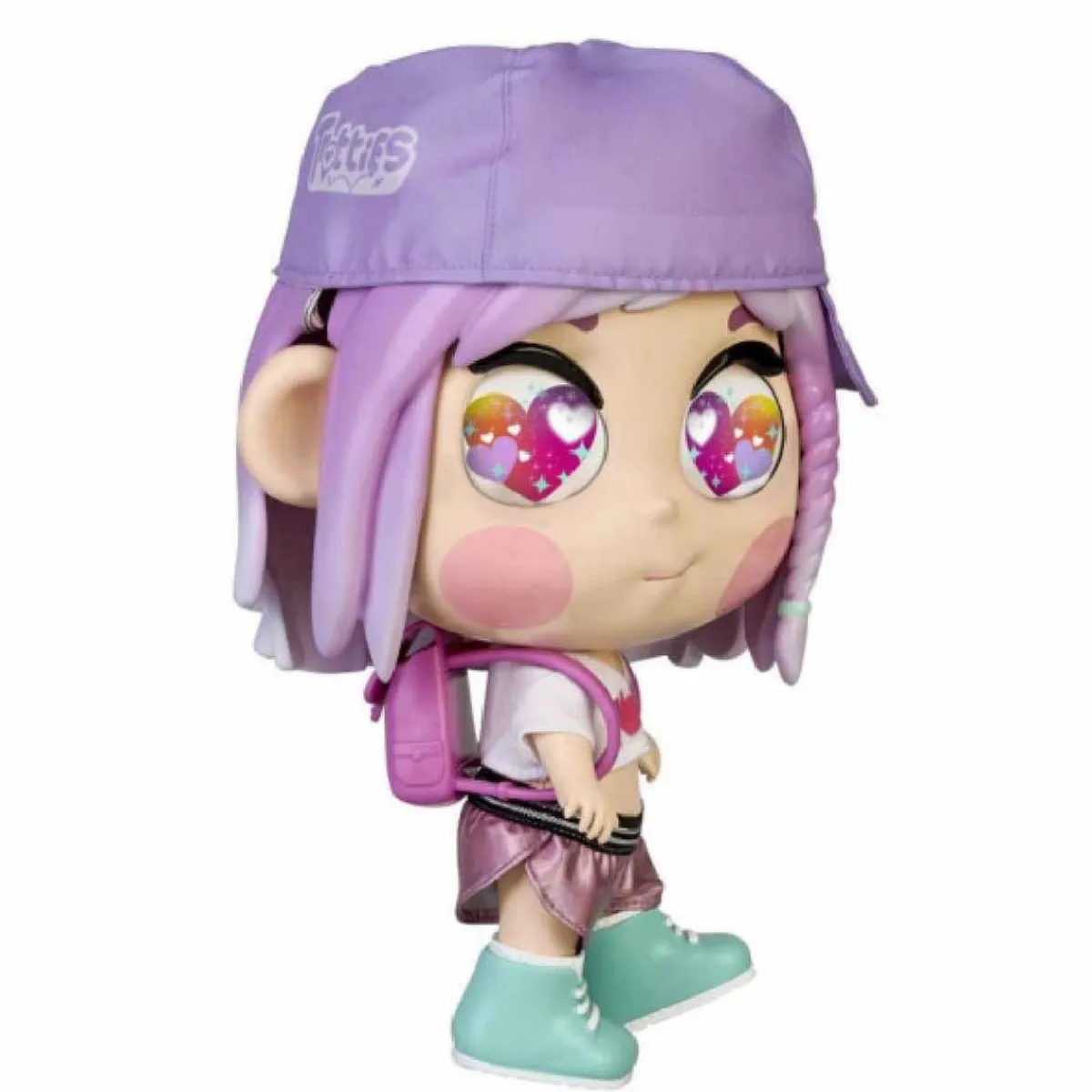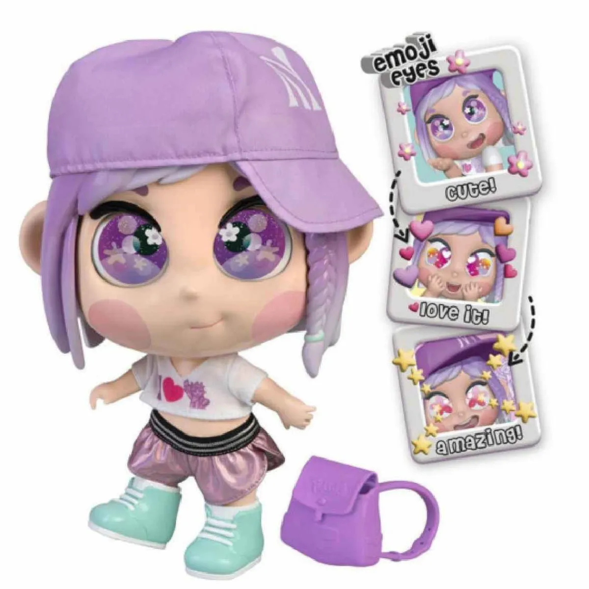 Emma va vestida con un traje veraniego, que incluye una camiseta blanca muy al estilo de Nueva York, una gorra púrpura, un pantalón corto púrpura deportivo y unas modernas zapatillas azules.