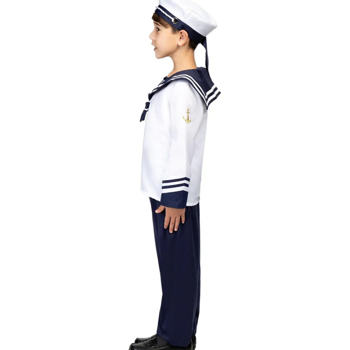 ¡Los pequeños aventureros vivirán mil historias en alta mar con este disfraz de marinero para niño! Incluye camiseta con pañuelo, pantalón y gorra en materiales resistentes y suaves (99% poliéster, 1% polipropileno). Los detalles náuticos, como los botones decorativos, estimulan el juego imaginativo. Perfecto para cumpleaños, obras escolares o cualquier día que requiera un toque de valentía marinera.