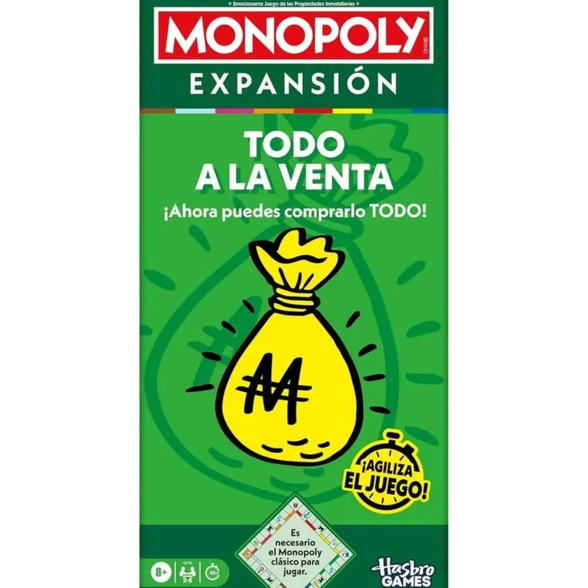 Añade la expansión «Todo a la Venta» a tu juego clásico de Monopoly (necesario para jugar, se vende por separado) y experimenta partidas más dinámicas y rápidas, ideales para disfrutar con amigos y familia. El giro estratégico que ofrece esta expansión no solo acorta el tiempo de juego a unos emocionantes 40 minutos, sino que también introduce nuevas formas de generar estrategias y lograr la victoria.