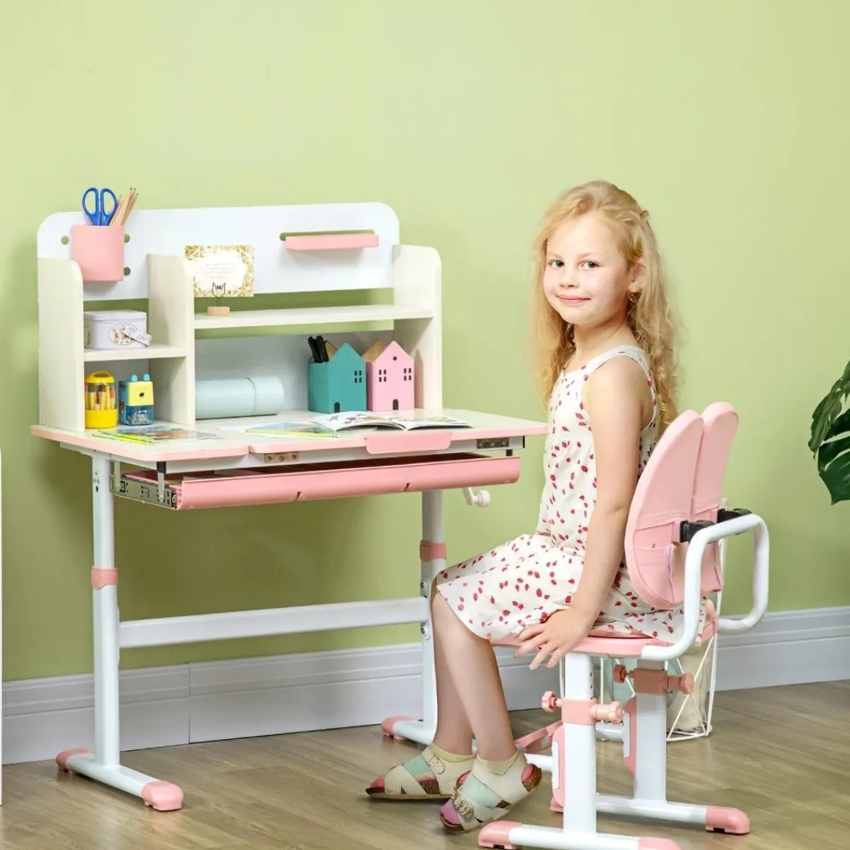 Homcom – Escritorio con estante y silla ajustable Rosa y Blanco, un conjunto que se adapta al crecimiento de los niños.