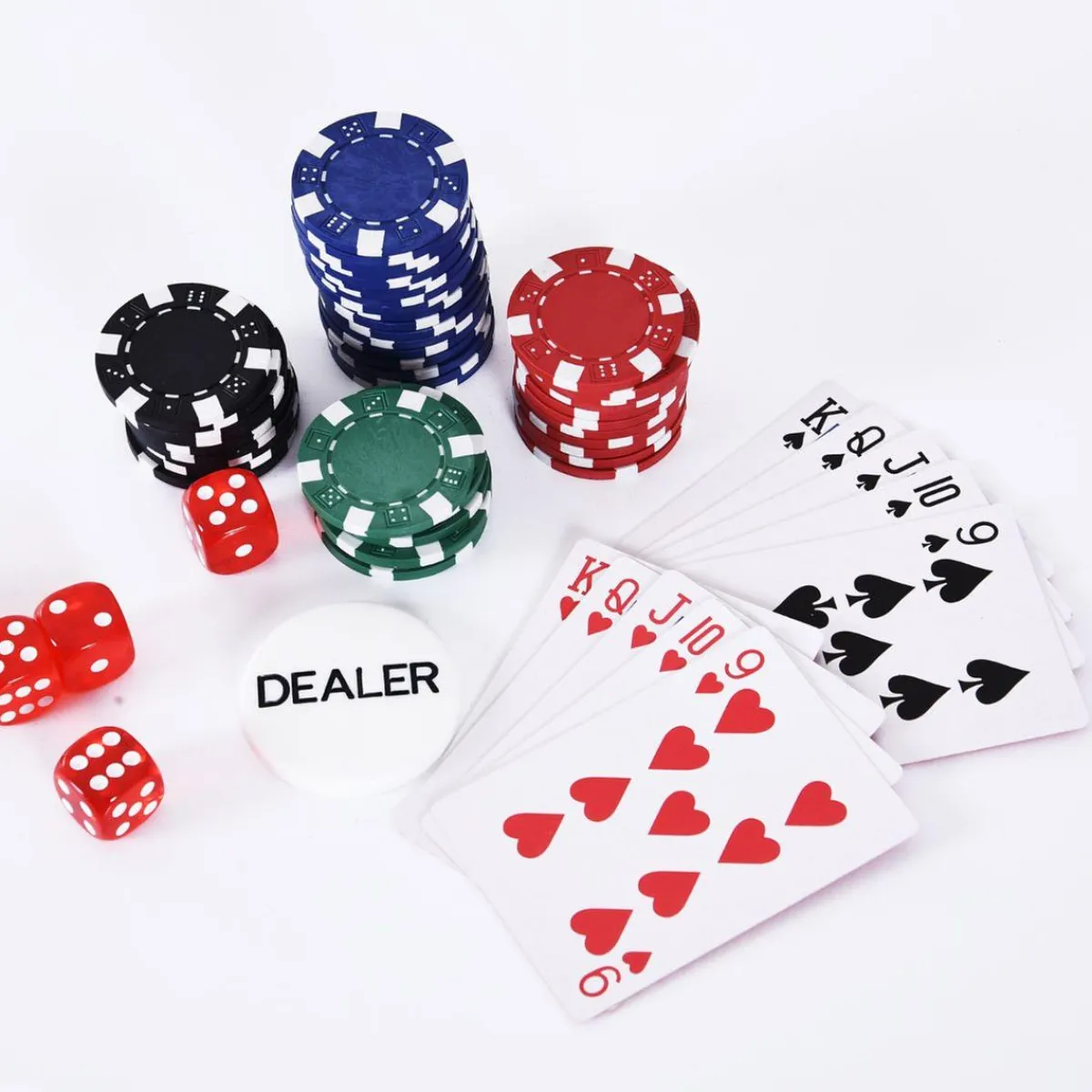 - Incluye 50 fichas negras, 50 fichas rojas, 50 fichas azules, 50 fichas verdes, 5 dados, 1 ficha de crupier y 2 barajas de cartas.