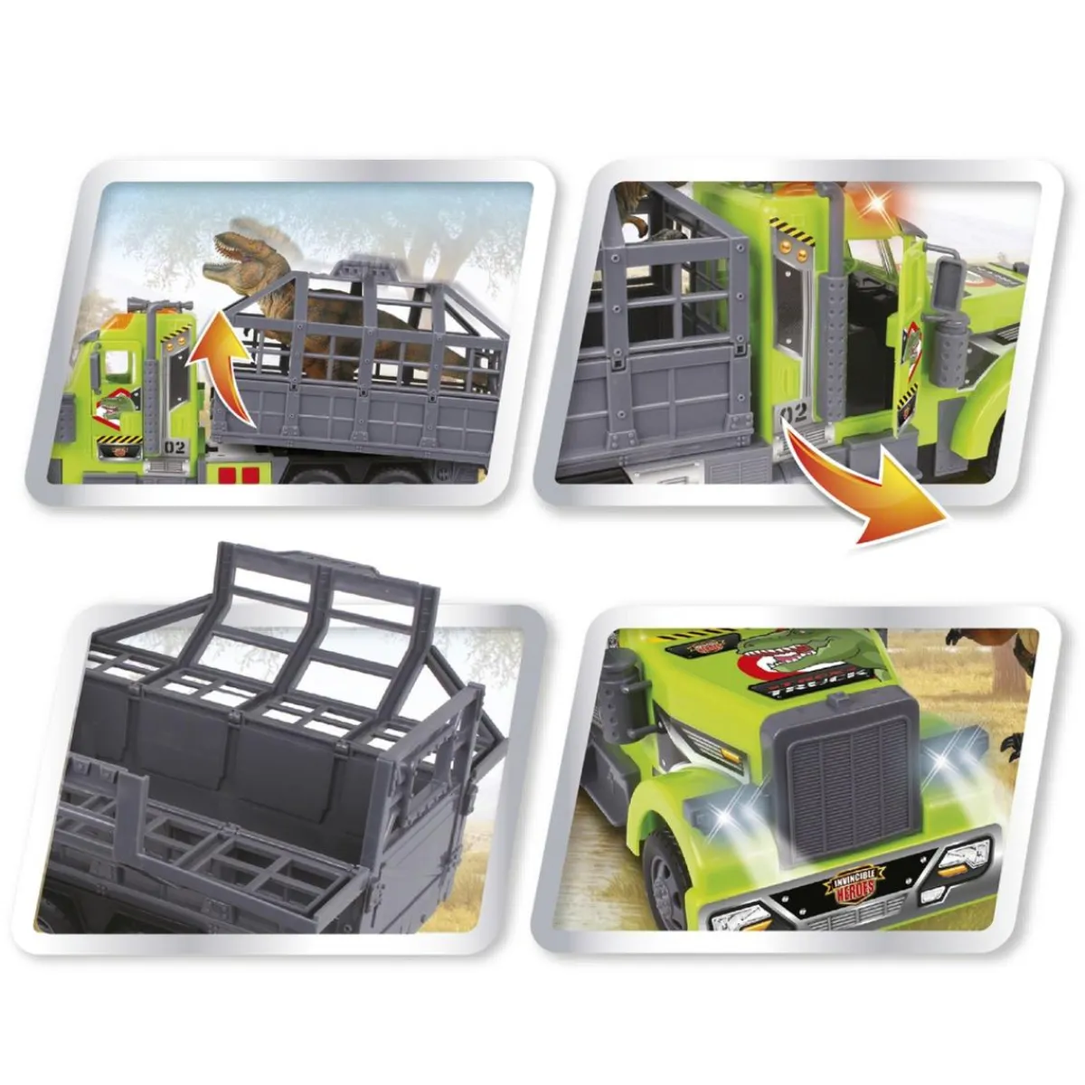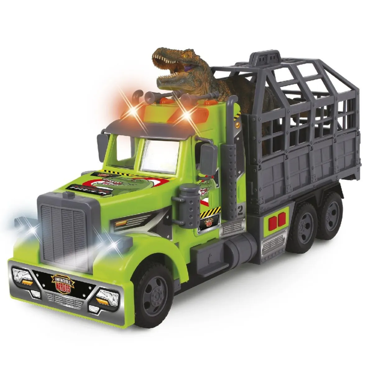 Invincible Heroes – Camión con dinosaurio, un camión de rescate con luces y sonido para rescatar al T-Rex que está en peligro.
