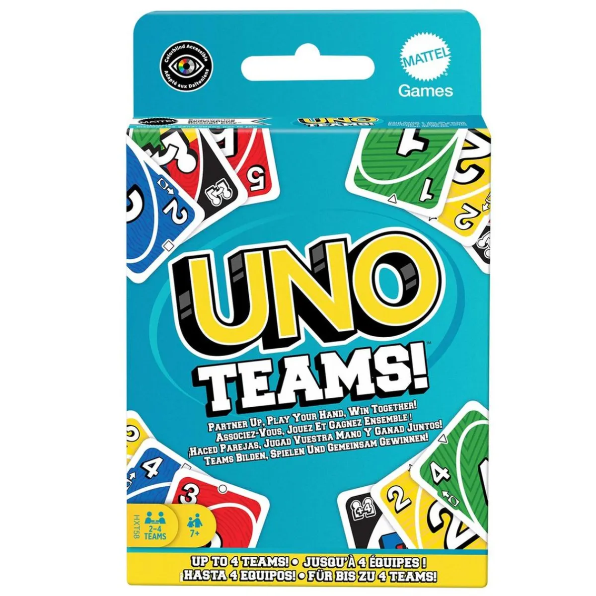 Este modo introduce cartas especiales inéditas como el Joker Juego en equipo y el Super Joker equipo, que permiten coordinar tus estrategias. Cartas especiales como el comodín “Juego en equipo” y el comodín “Roba cuatro en equipo” ayudarán a los equipos a ganar unidos. Con la carta a Dar a, puedes compartir una carta de tu elección con tu compañero de equipo, y si uno de los miembros del equipo termina su mano, toma la mitad de las cartas restantes de su compañero para continuar el juego. Si a un jugador (o a su compañero) le queda solo una carta, debe gritar «UNO» en voz alta. Un juego divertido y accesible que refuerza el espíritu de equipo y que encantará a los aficionados de UNO y de cooperación.