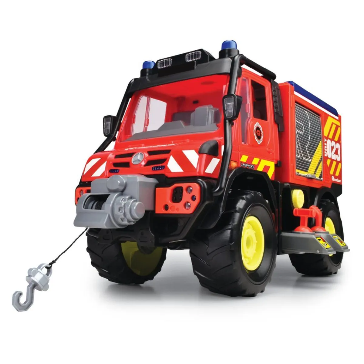 - Vehículo oficial Mercedes UNIMOG-Rosenbauer con luces, sonidos y ruedas con suspensión