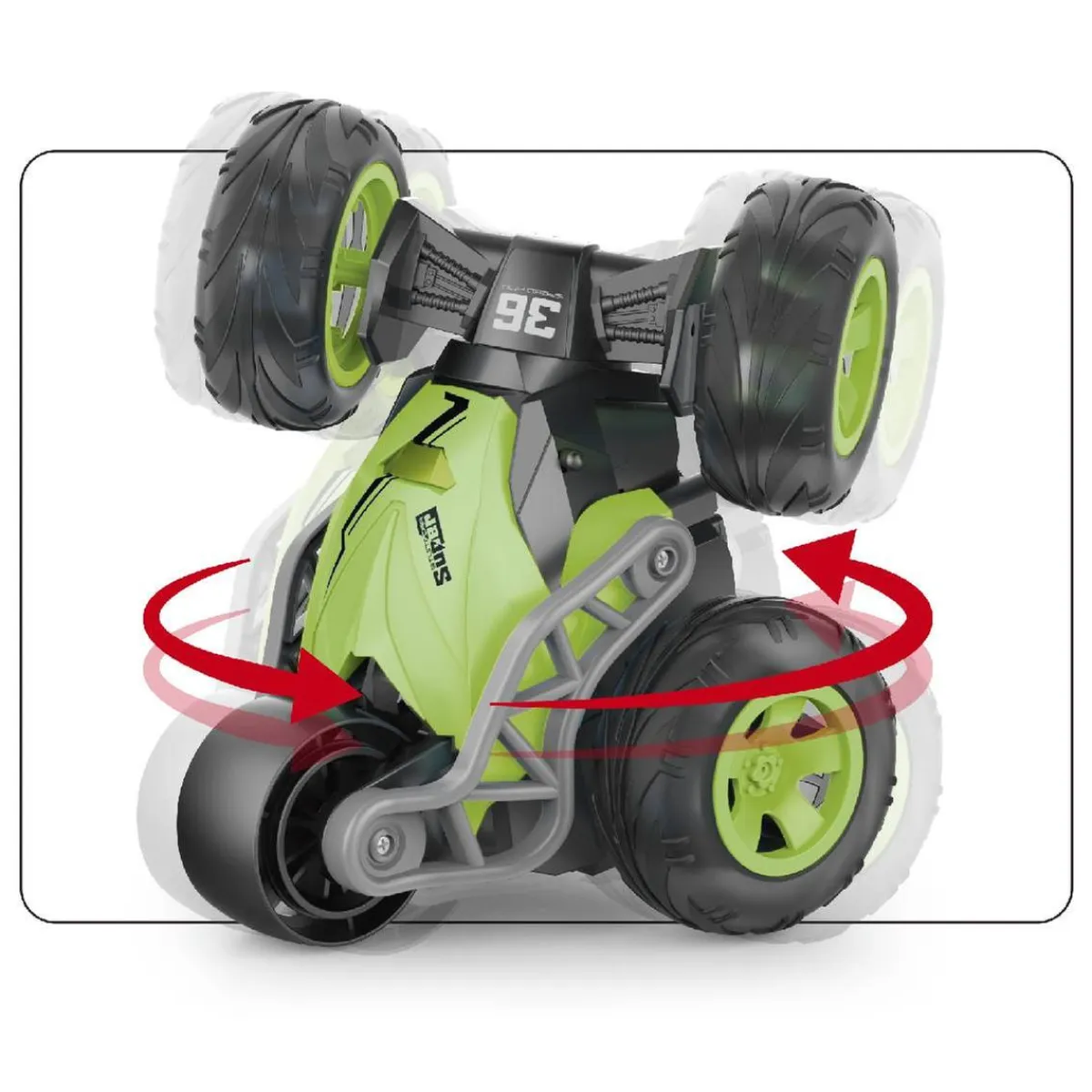 ¡Vuélvete loco con emocionantes acrobacias con este coche RC! ¡Sus 5 ruedas le permiten realizar emocionantes maniobras, giros y conducción vertical! ¡Además las ruedas tienen luz!