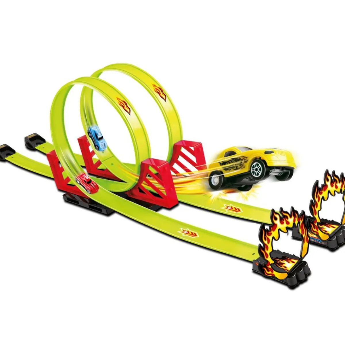 Doble pista acrobática de 548 cm, con dos coches de carga trasera incluidos para jugar con amigos y hacer carreras alucinantes.