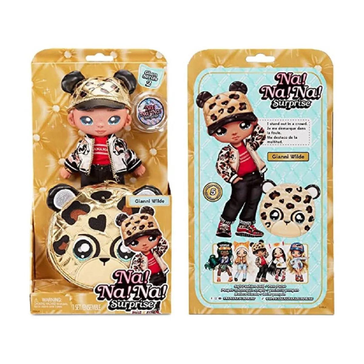 Na! Na! Na! Surprise – Gianni Wilde – Muñeco Glam Serie 2, un muñeco de moda suave de 19 cm aproximadamente y un monedero inspirado en un guepardo.