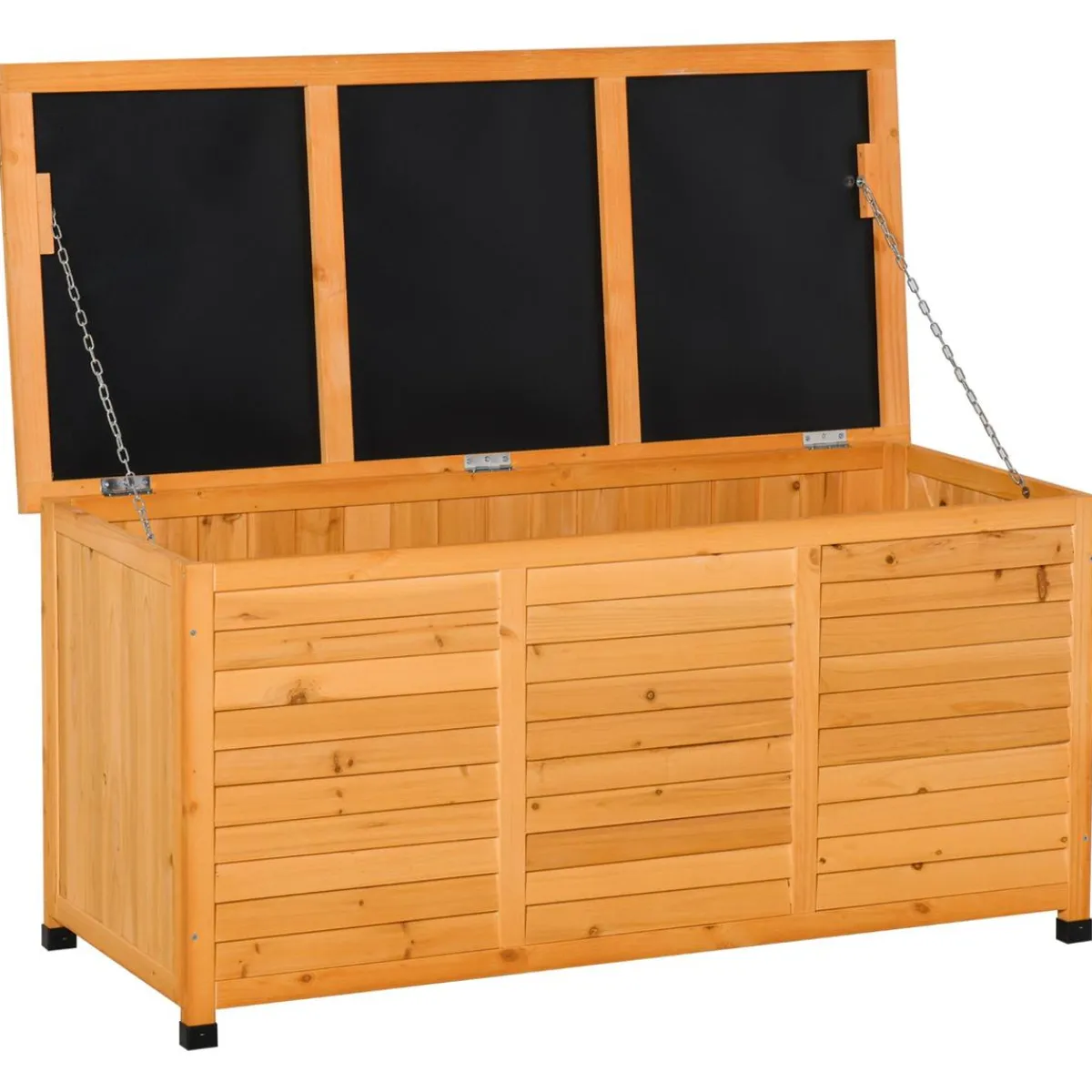 Outsunny – Baúl de jardín de madera. Este baúl de almacenamiento para exterior es una solución ideal para tener en tu jardín. Un amplio espacio para almacenar herramientas de jardinería, juguetes de exterior, etc. Hecho de madera de abeto maciza tratada para resistir a la intemperie y con protectores en las patas para evitar el contacto de la madera con el suelo. Se puede usar como baúl de almacenaje y también para sentarse. Su diseño de persiana ofrece una buena ventilación interior. ¡Funcional y bonito!