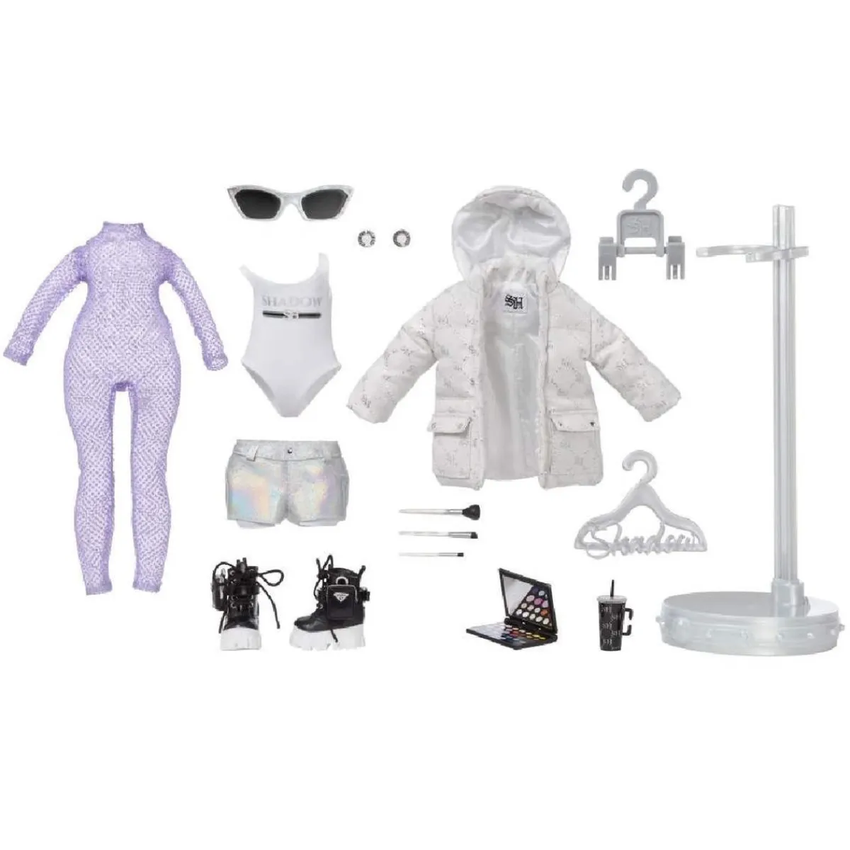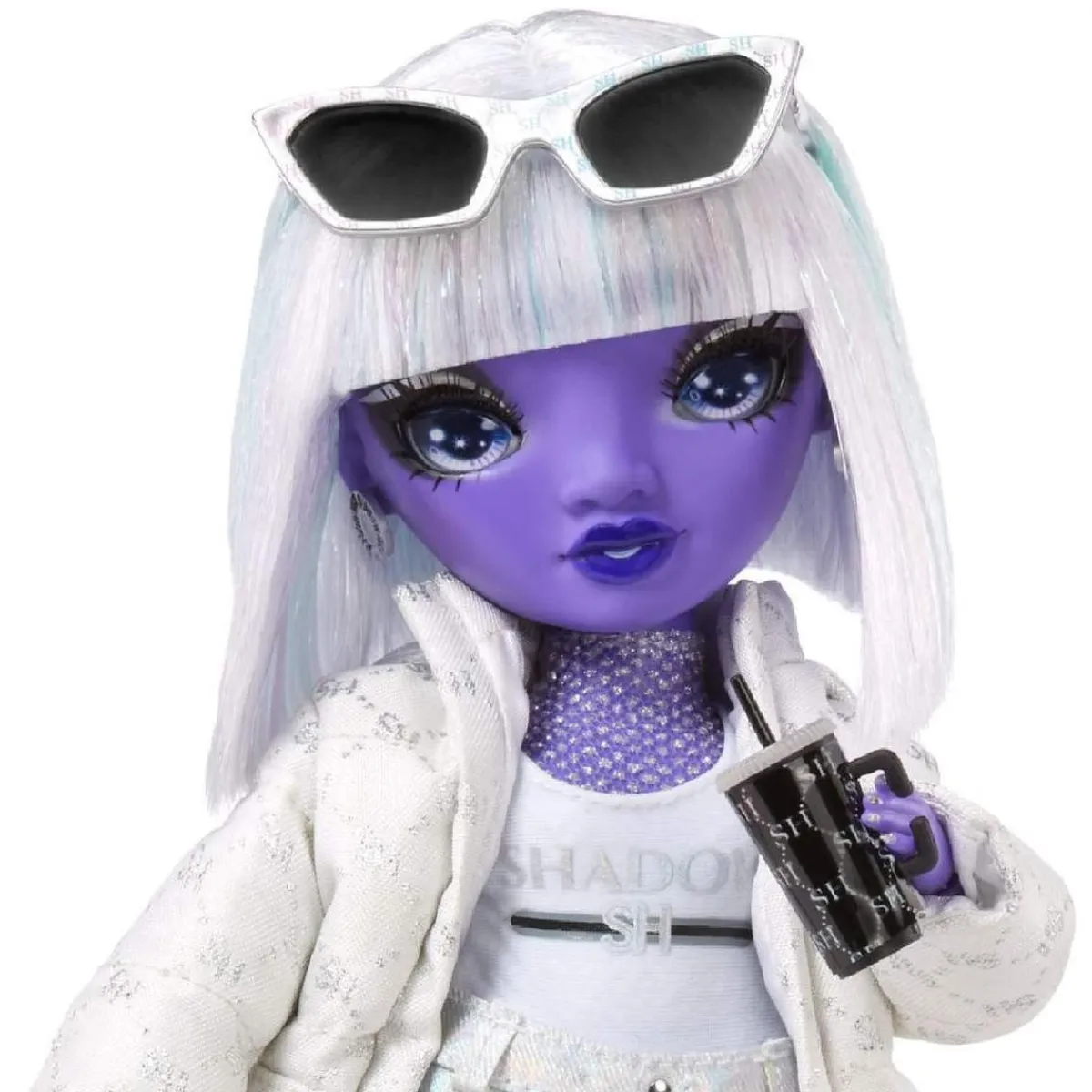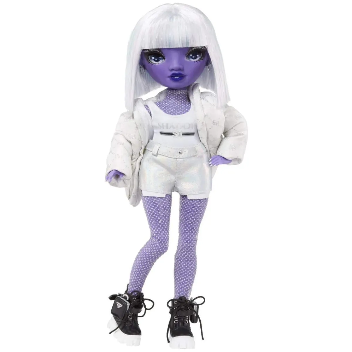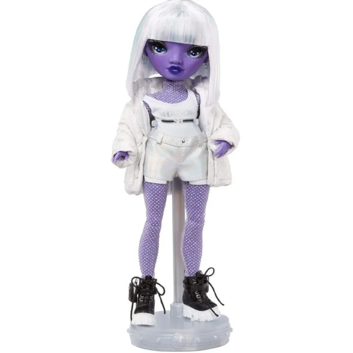 Esta muñeca Shadow High de 27 cm, aproximadamente, tiene un estilo único en tonos morado y blanco de la cabeza a los pies..
