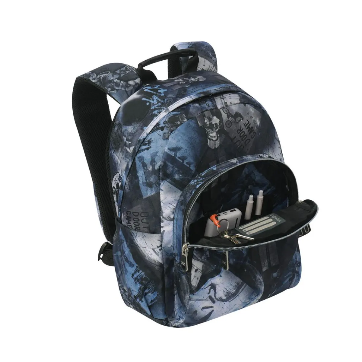 Cuenta con dos bolsillos frontales con cierre en cremallera para un acceso rápido, compartimentos laterales para botella o paraguas, y un organizador interior con portallaves. Además, incorpora una práctica red elástica en una de las correas para guardar el carnet escolar o una tarjeta de acceso.