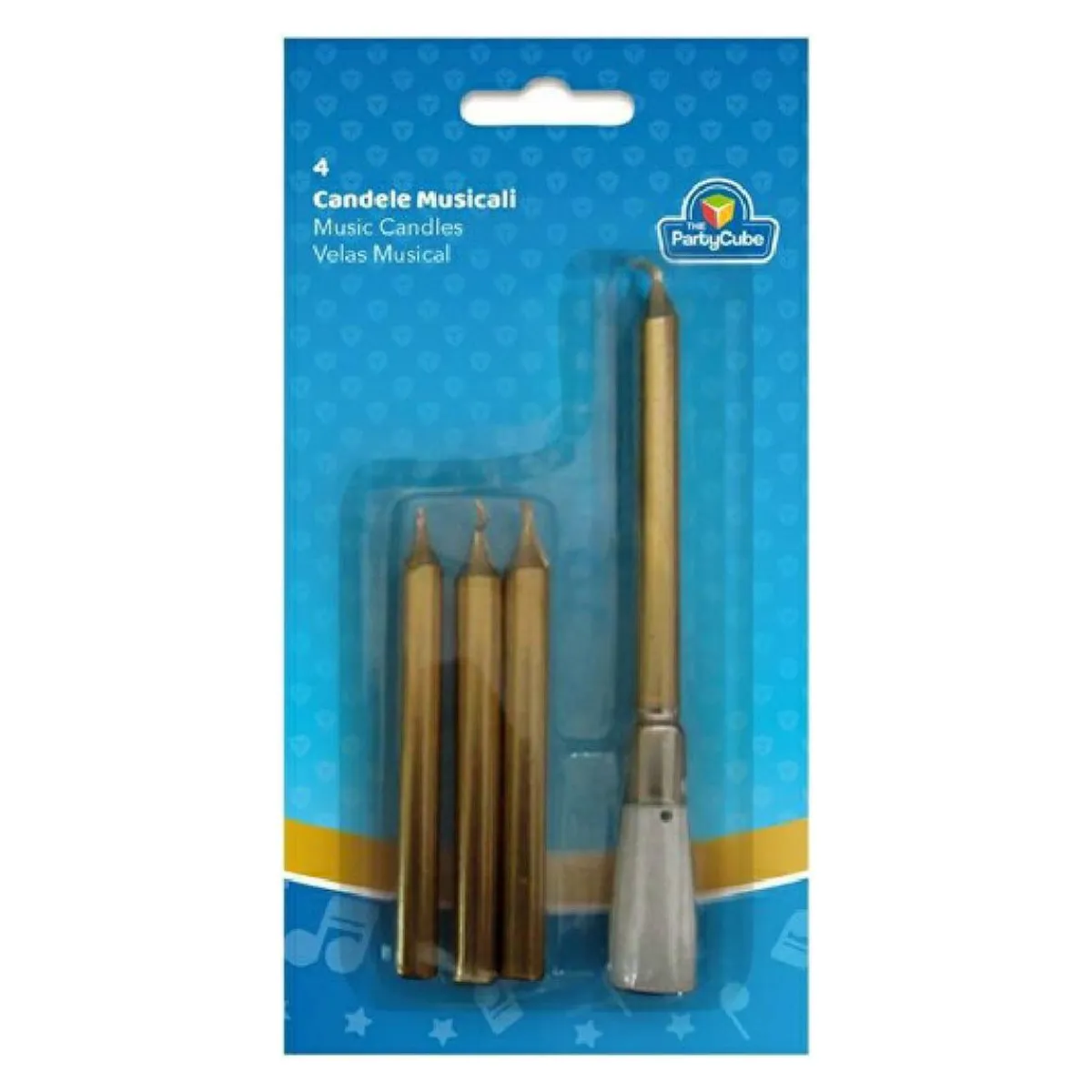 Este pack contiene 4 velas doradas y un portavelas musical. ¡Ideal para el cumpleaños!