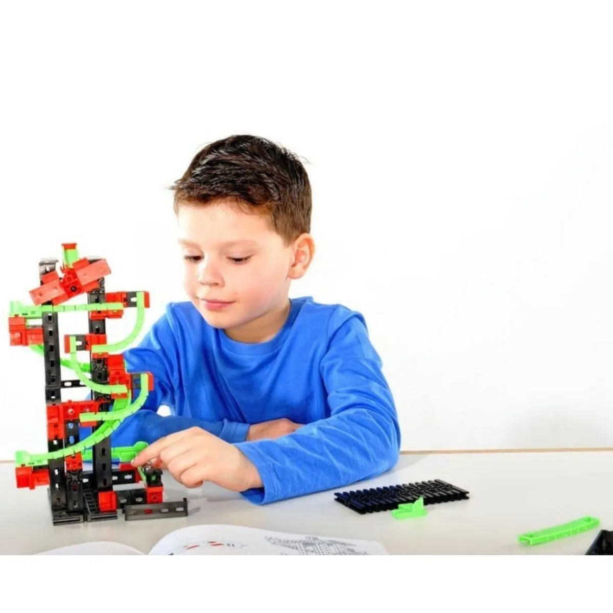 Las bolas se recogen al final de la pista y pueden recuperarse fácilmente. Con más de 140 piezas y las instrucciones de construcción, se pueden construir tres impresionantes modelos de circuitos de bolas. Además, los jóvenes ingenieros pueden diseñar una cantidad prácticamente ilimitada de nuevos recorridos según sus propias ideas.