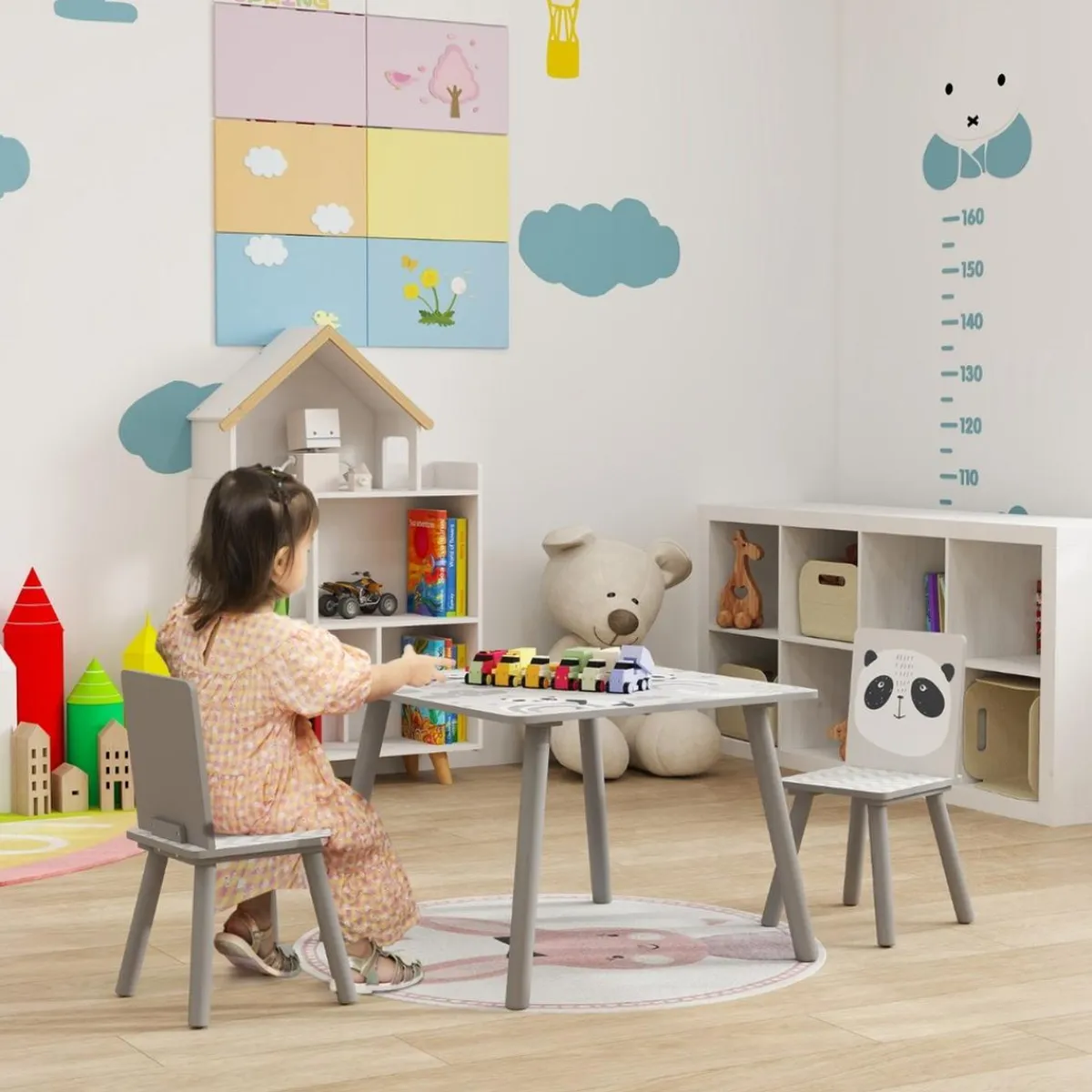 Hecho de MDF y patas de madera de pino, el respaldo de las sillas y la encimera de la mesa presentan un bonito estampado con cenefas y pandas, que llamará la atención de los más pequeños.