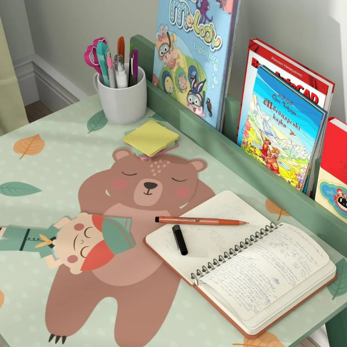 Descubre el encantador conjunto de mesa y silla para niños de Aiyaplay. Este conjunto incluye un estante integrado, ideal para organizar los libros favoritos de tus pequeños. Con un bonito color verde y un adorable diseño de oso, esta mesa y silla ofrecen el espacio perfecto para disfrutar de actividades como dibujar, pintar, jugar y estudiar.