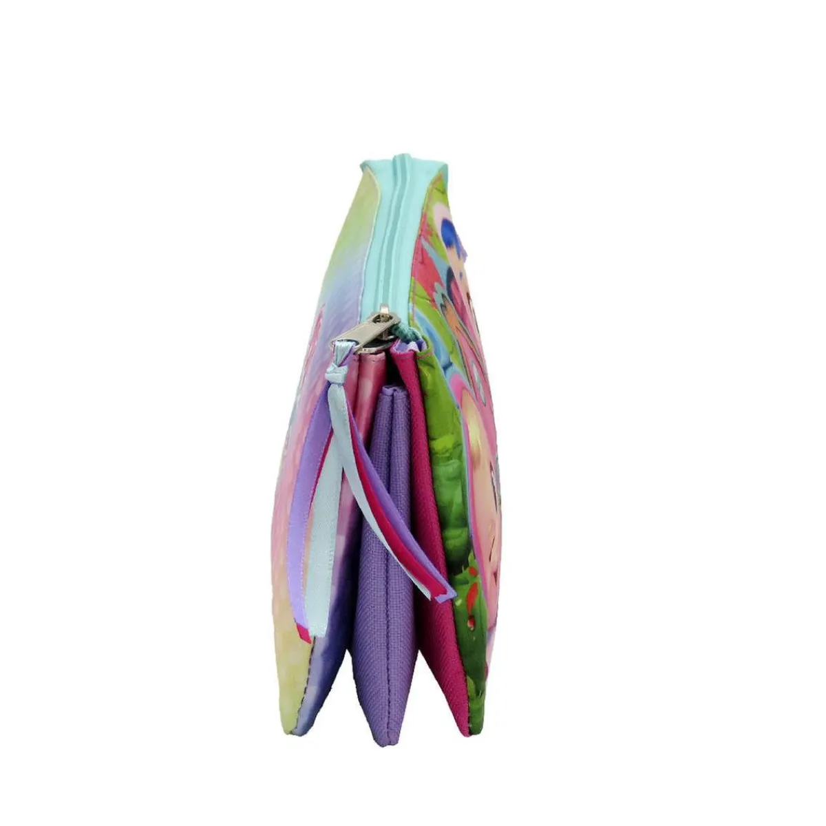 Con cremallera exterior y otra interior para el compartimento central. Tirador con coloridas cintas para facilitar su apertura.