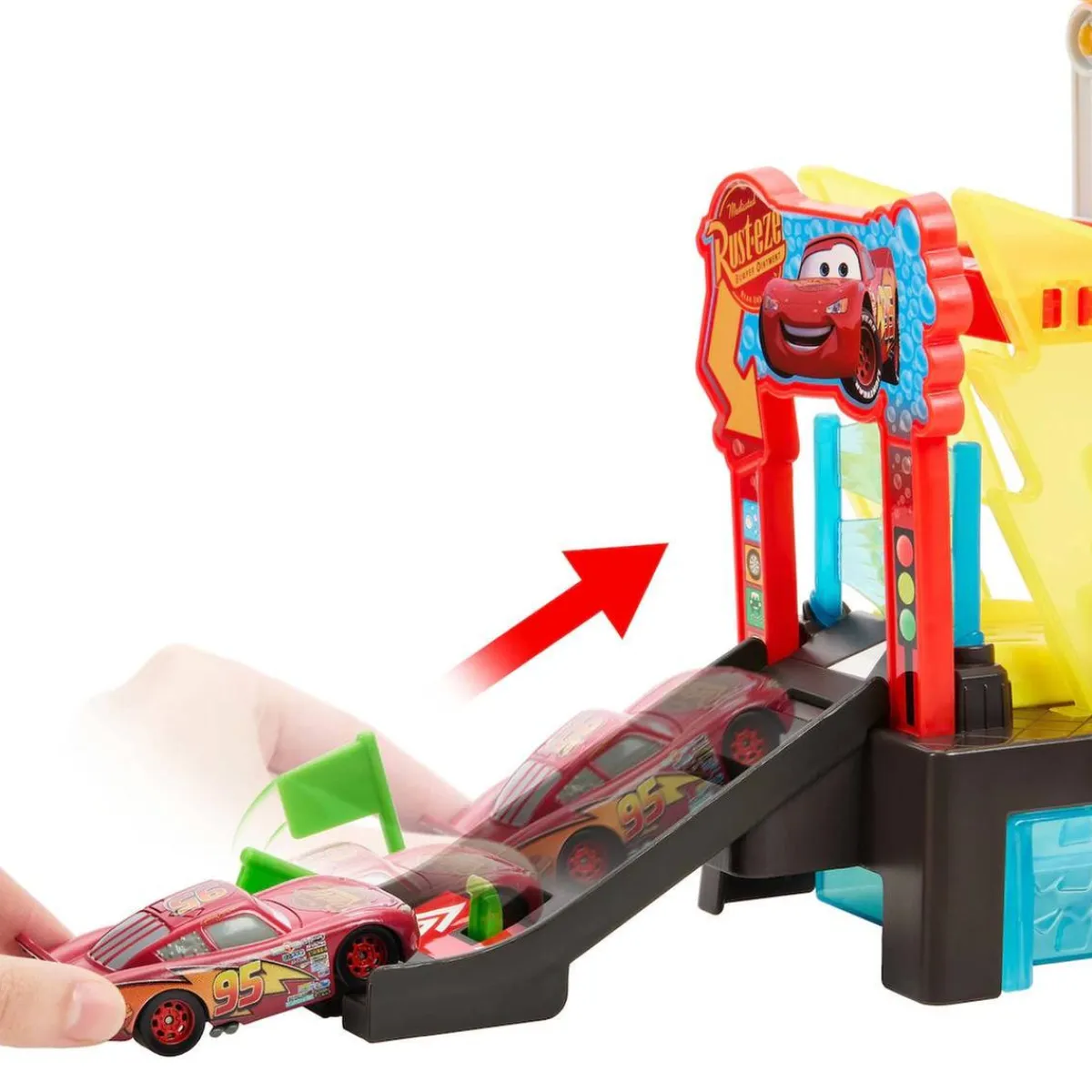 - Túnel de lavado completo: Incluye rampas, rodillos de lavado, duchas de agua y un sistema de lanzamiento para que Rayo McQueen salga disparado al final del circuito.