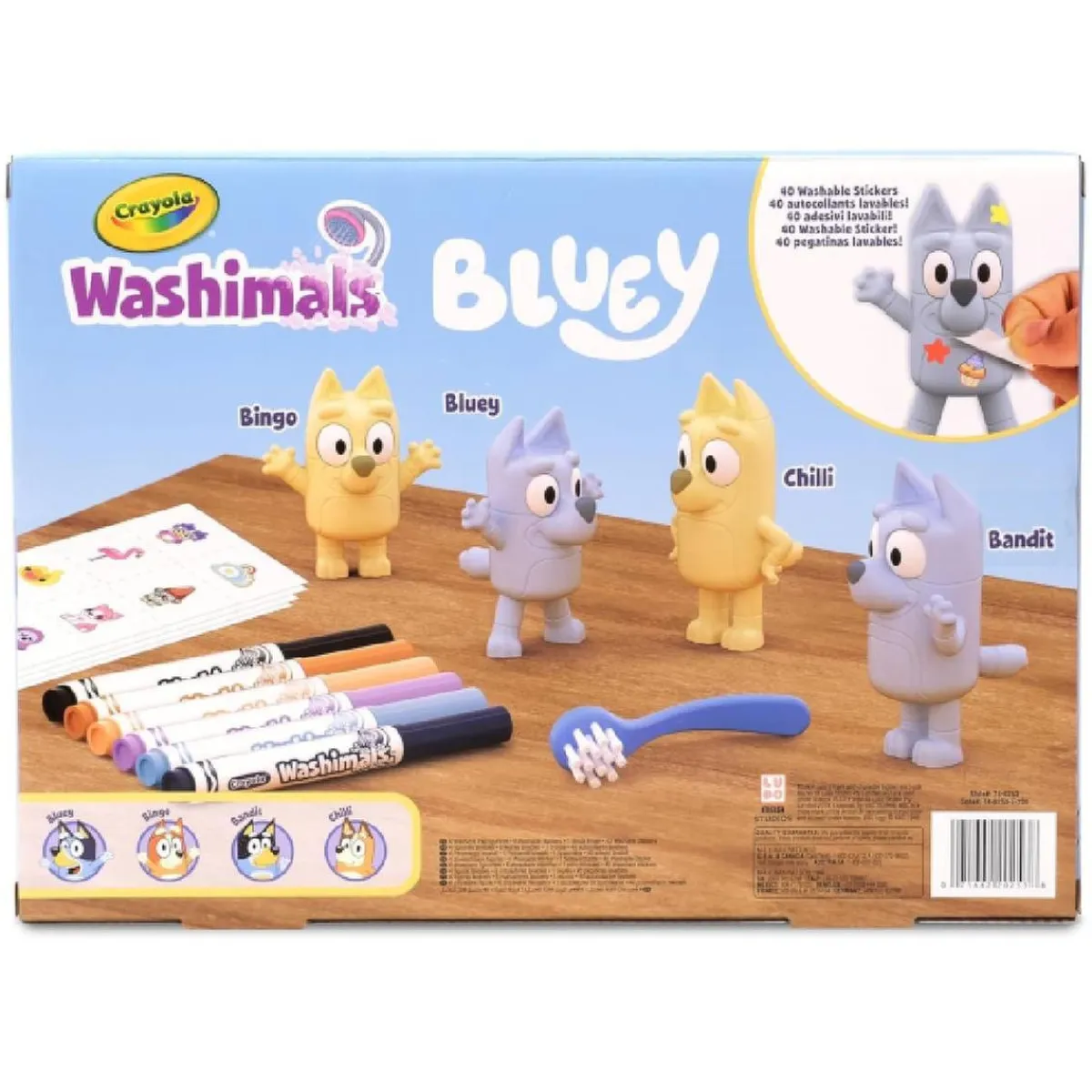 En el pack encontrarás 4 mascotas lavables de Bluey, 6 rotuladores lavables Washimals, 40 pegatinas lavables para personalizar y 1 cepillo para lavar las figuras.