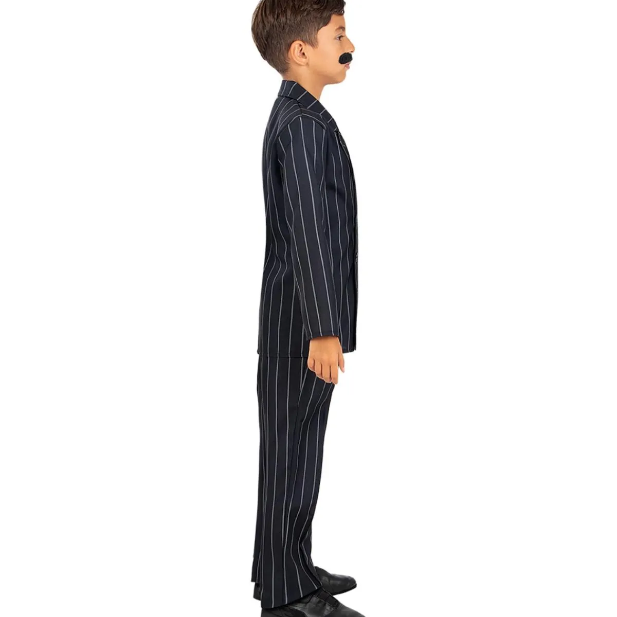 Este disfraz en talla 10-12 años incluye pantalón, chaqueta, corbata y bigote, recreando a Gómez Addams en versión infantil. Es perfecto para Halloween o representaciones escolares.