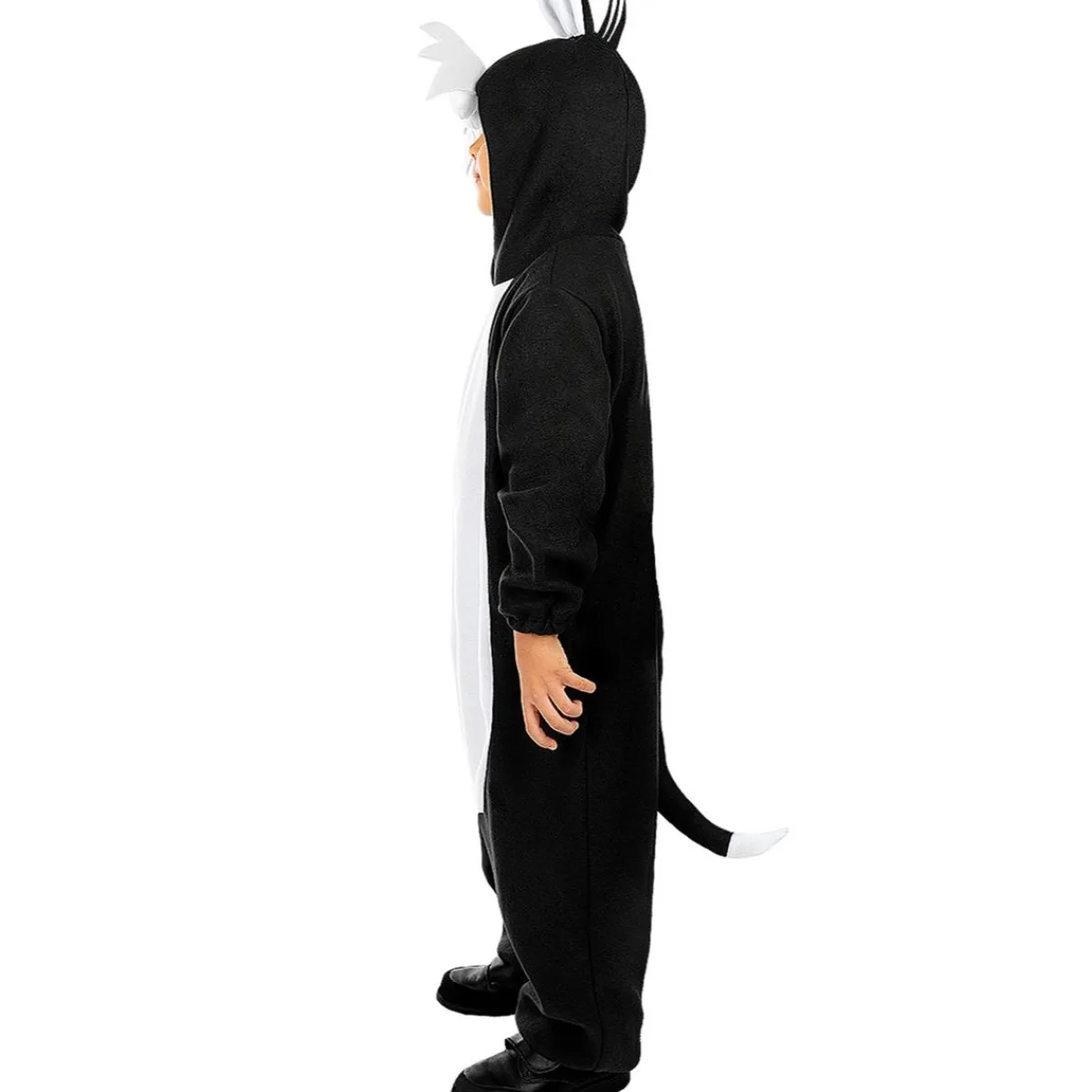 Este disfraz en talla 5-6 años convierte a los niños en Silvestre, el carismático gato de Looney Tunes. Su mono con capucha, que combina el negro con detalles blancos, recrea a la perfección la imagen del personaje que siempre persigue a Piolín. Es un diseño pensado para la comodidad y diversión de los pequeños.