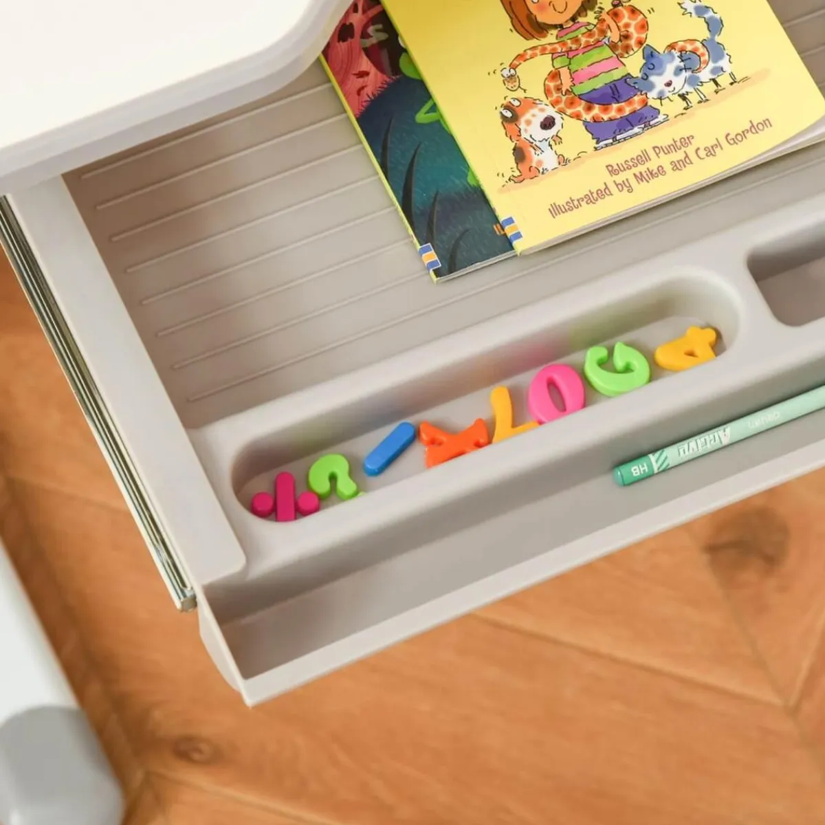 Homcom – Conjunto Pupitre reclinable + Silla Gris con lámpara. Este juego de escritorio y silla infantil es la opción ideal para los más pequeños. Con una estructura resistente y duradera, tanto la mesa como la silla tienen bordes lisos y redondeados para garantizar la máxima seguridad. La altura de ambos elementos se puede ajustar fácilmente para adaptarse al crecimiento de tus hijos. Gracias a su diseño sencillo, se integrará perfectamente en el cuarto de los niños y combinará con la decoración de tu hogar.