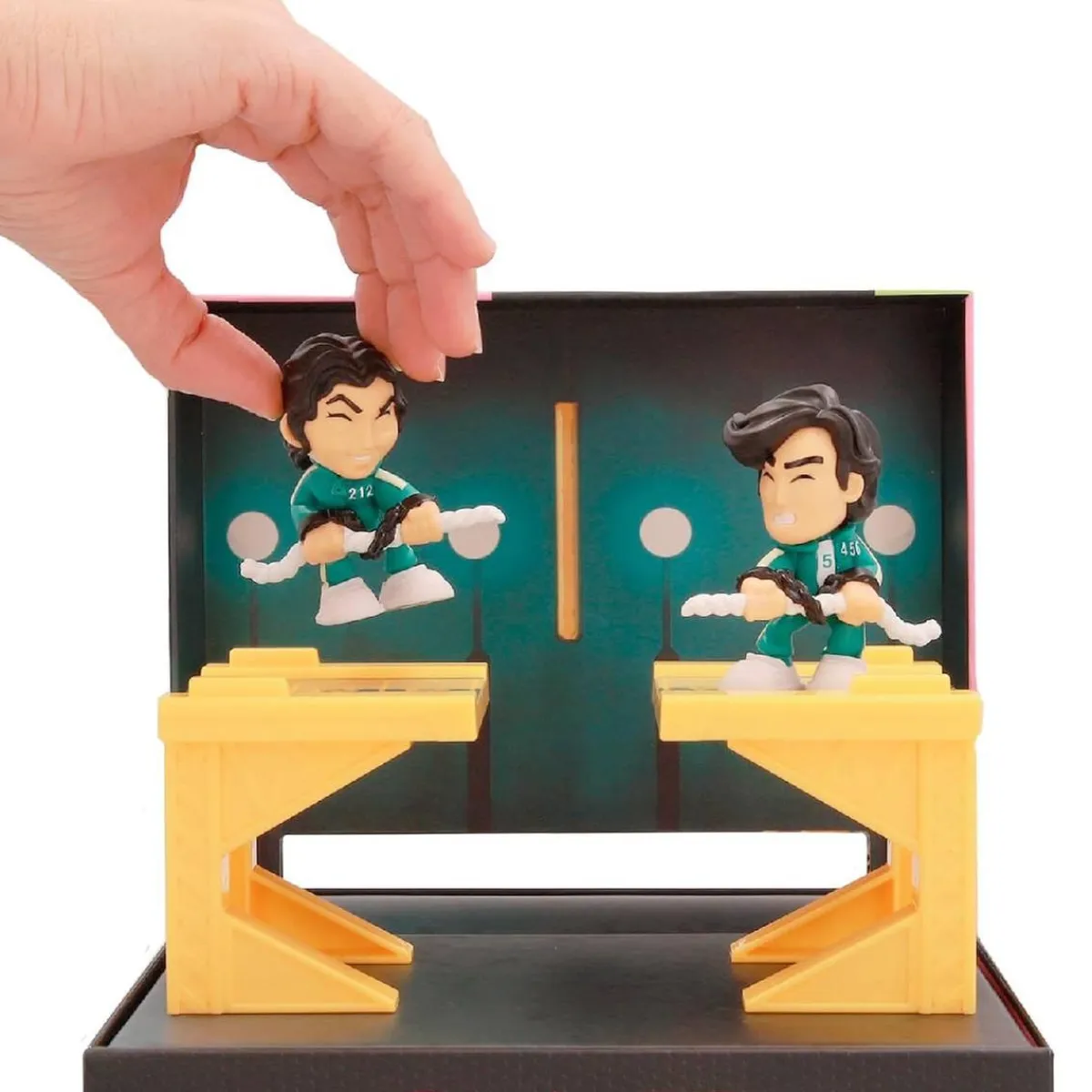 Desafía a tus oponentes tirando de la cuerda en el tira y afloja, intenta no caer sobre el pasaje de cristal y gana Squid Game. En cada caja encontrarás uno de los juegos completos. Recrea la escena con los 2 personajes exclusivos y el minijuego de cartón, perfecto para exhibir. Luego juega, tira los dados y mueve los personajes. ¿Quién ganará?