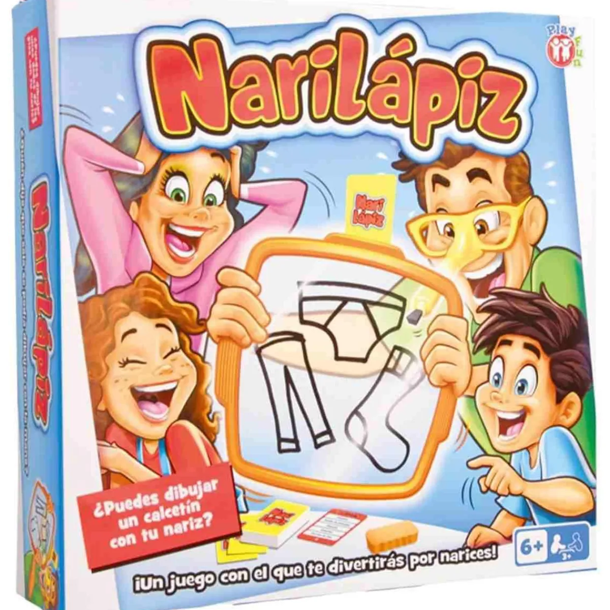 «IMC Toys Juego de mesa Narilápiz» es el entretenimiento perfecto para toda la familia. ¿Quién dijo que solo se puede dibujar con la mano? Este juego te permite convertirte en un artista usando solo tu nariz y un rotulador. La dinámica es sencilla: ponte las gafas especiales, elige una tarjeta del mazo y trata de dibujar en la pizarra… ¡con tu nariz! Los demás jugadores tendrán que adivinar lo que estás dibujando.