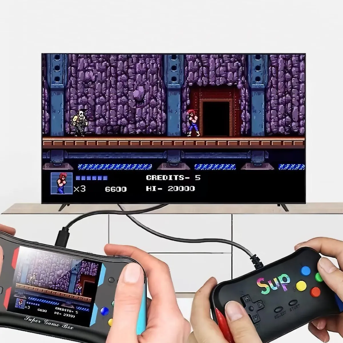 La consola cuenta con una batería recargable de 1200 mAh, lo que garantiza horas de diversión continua sin tener que preocuparte por reemplazar las baterías constantemente. Después de una carga completa, podrás disfrutar de aproximadamente 4 a 6 horas de juego.