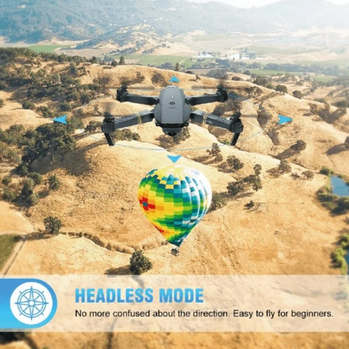3D Flips con una tecla y modo sin cabeza y recorte. ¡El dron EACHINE E58 incluye los nuevos efectos especiales de rodamiento 3D increíblemente sorprendentes! La función de retorno con una tecla permite que el dron regrese automáticamente sin perderlo. La opción de modo sin cabeza puede hacer que la parte frontal del dron sea la misma que el control remoto, lo que facilita el vuelo a su destino. Con la función Trimming, puedes ajustar que el dron se estabilice durante el vuelo.