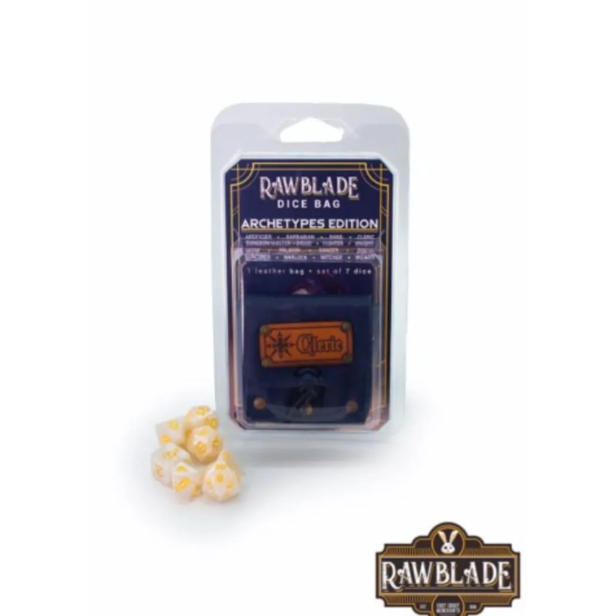 Rawblade – Dados y bolsa de cuero Clérigo, los dados del clérigo más místicos para tu juego de rol.