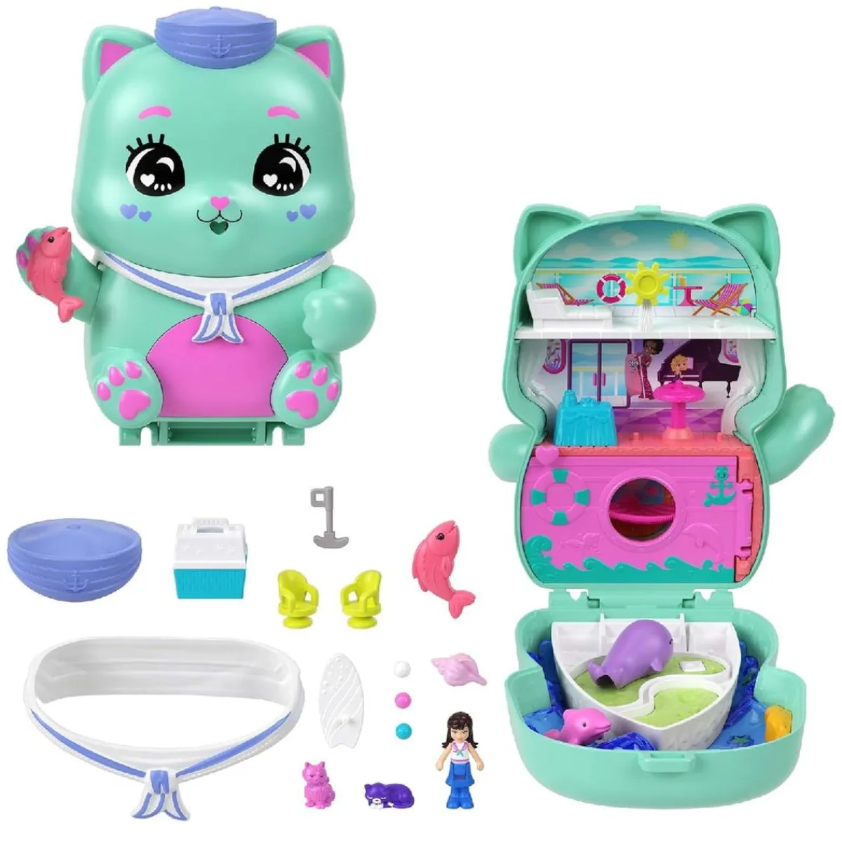 Cuando hayas terminado de adornar el exterior, abre el estuche para descubrir una adorable muñequita, múltiples funciones de juego y más de 10 accesorios.
