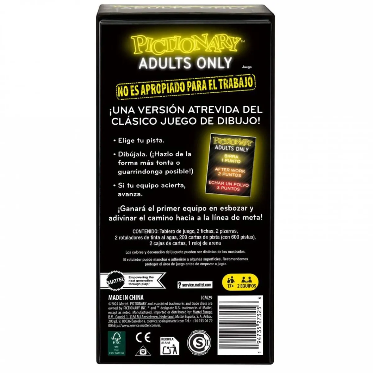 Mattel te presenta una versión atrevida de tu juego de mesa favorito: ¡Pictionary para adultos! En este juego, la creatividad y el sentido del humor son la clave. Los jugadores eligen el nivel de atrevimiento de las pistas y se lanzan a dibujar lo que se les ocurra para que sus compañeros de equipo lo adivinen. Las pistas pueden ser desde inocentes hasta picantes, y cuantas más atrevidas sean, más puntos conseguirás. ¡Imagina dividir una pista en dibujos ridículos! Con Pictionary, cada partida es única y está llena de risas, convirtiéndolo en la opción perfecta para esas noches especiales con amigos. Con su tablero, fichas y un montón de cartas de pistas, cada juego se convierte en una aventura divertida, donde el objetivo es ser el primer equipo en llegar a la meta. ¿Estás preparado para un rato de diversión desenfadada? ¡No te lo pierdas!