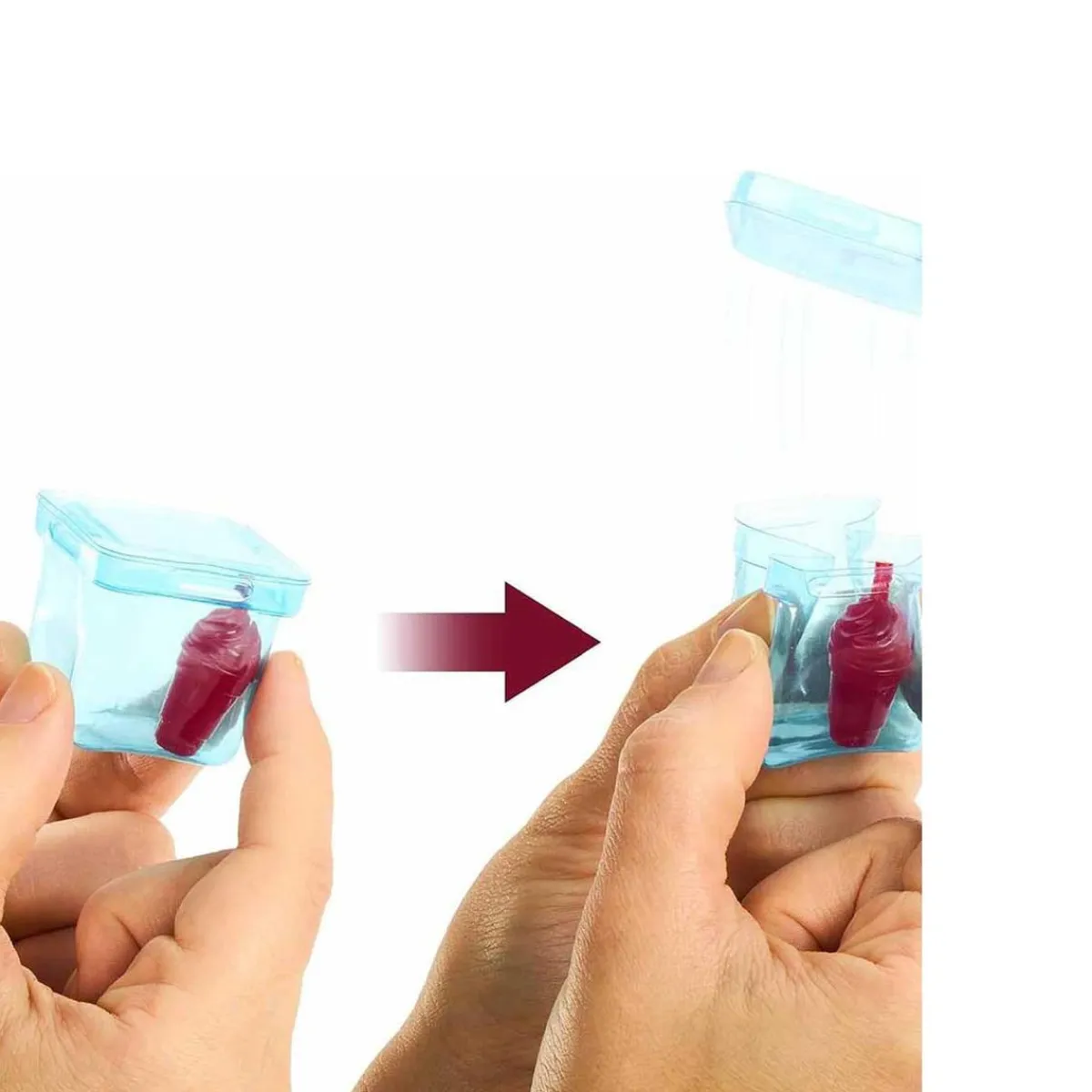 Después, vuelve a enroscar la tapa y usa la pajita para romper la parte superior y liberar el Slime rojo. ¡Mira cómo cubre los cubitos de hielo!