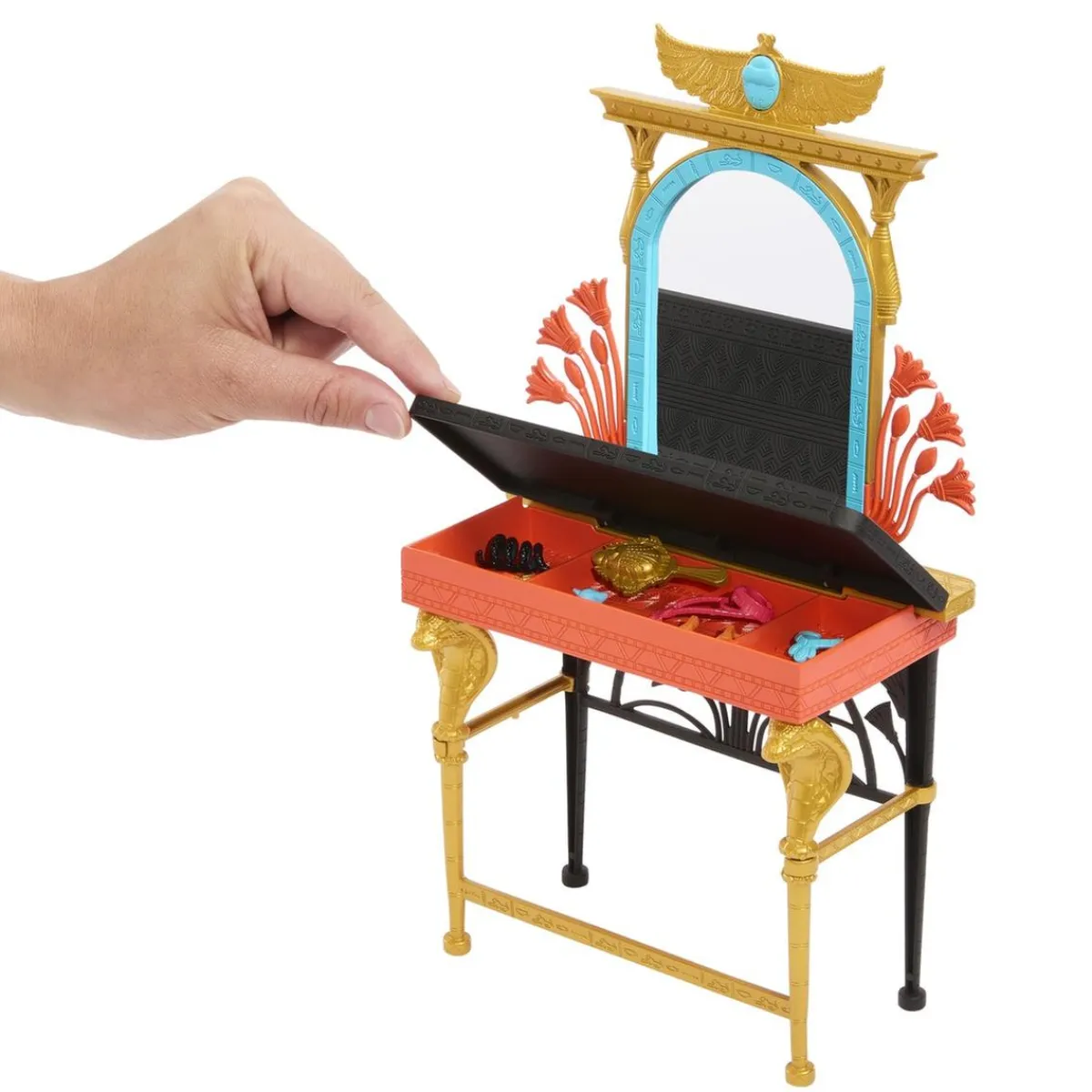 ¡Prepárate para deslumbrar con la muñeca » Cleo De Nile»! Este conjunto de Monster High es el máximo exponente del lujo y el estilo. Cleo De Nile, una momia de realeza, encuentra su momento perfecto de relax con una rutina de belleza única. El tocador es su santuario personal, con un diseño dorado y detalles inspirados en la antigua realeza egipcia, donde puede jugar con su peinado o añadir accesorios a su atuendo increíblemente chic.