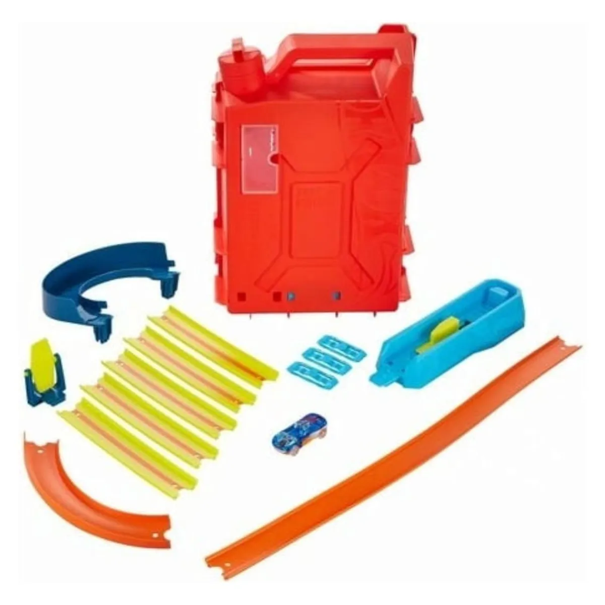 Tiene todas las piezas rectas y curvas necesarias para construir una emocionante pista de carreras de acrobacias de Hot Wheels. También hay un coche Hot Wheels para que puedas empezar a jugar de inmediato.
