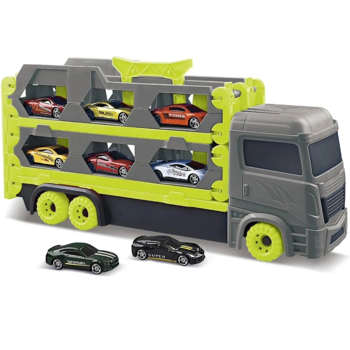El camión tiene espacio para guardar varios coches en su interior (¡incluye 2 vehículos de metal!) y cuenta con una práctica asa para transportarlo fácilmente donde quieras. Los pequeños pilotos podrán cargar, conducir y desplegar su pista en cualquier lugar, creando infinitas aventuras de motor.
