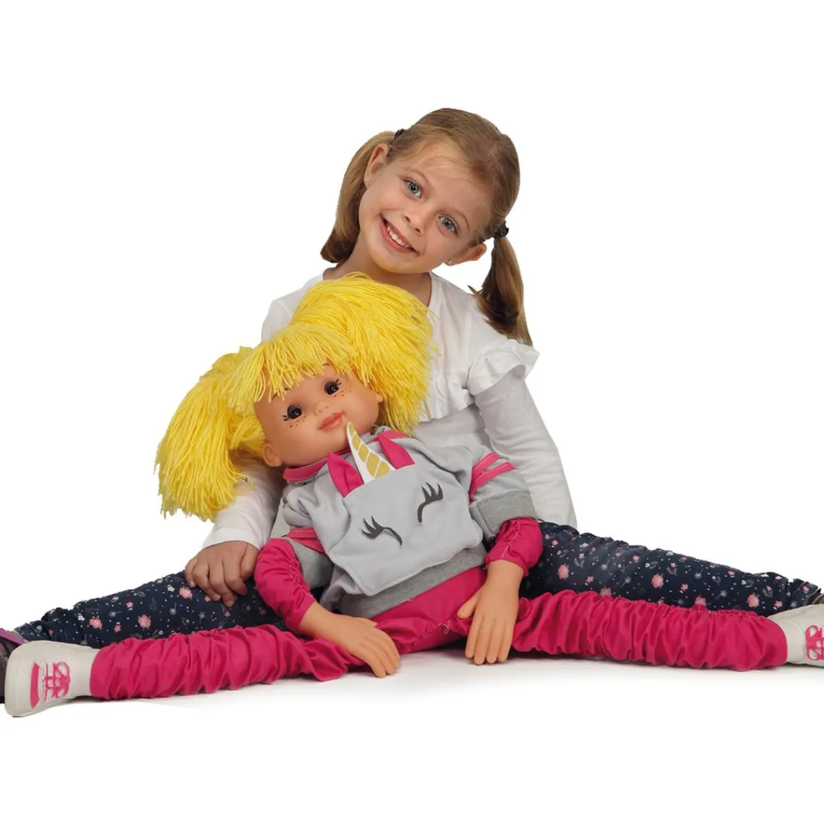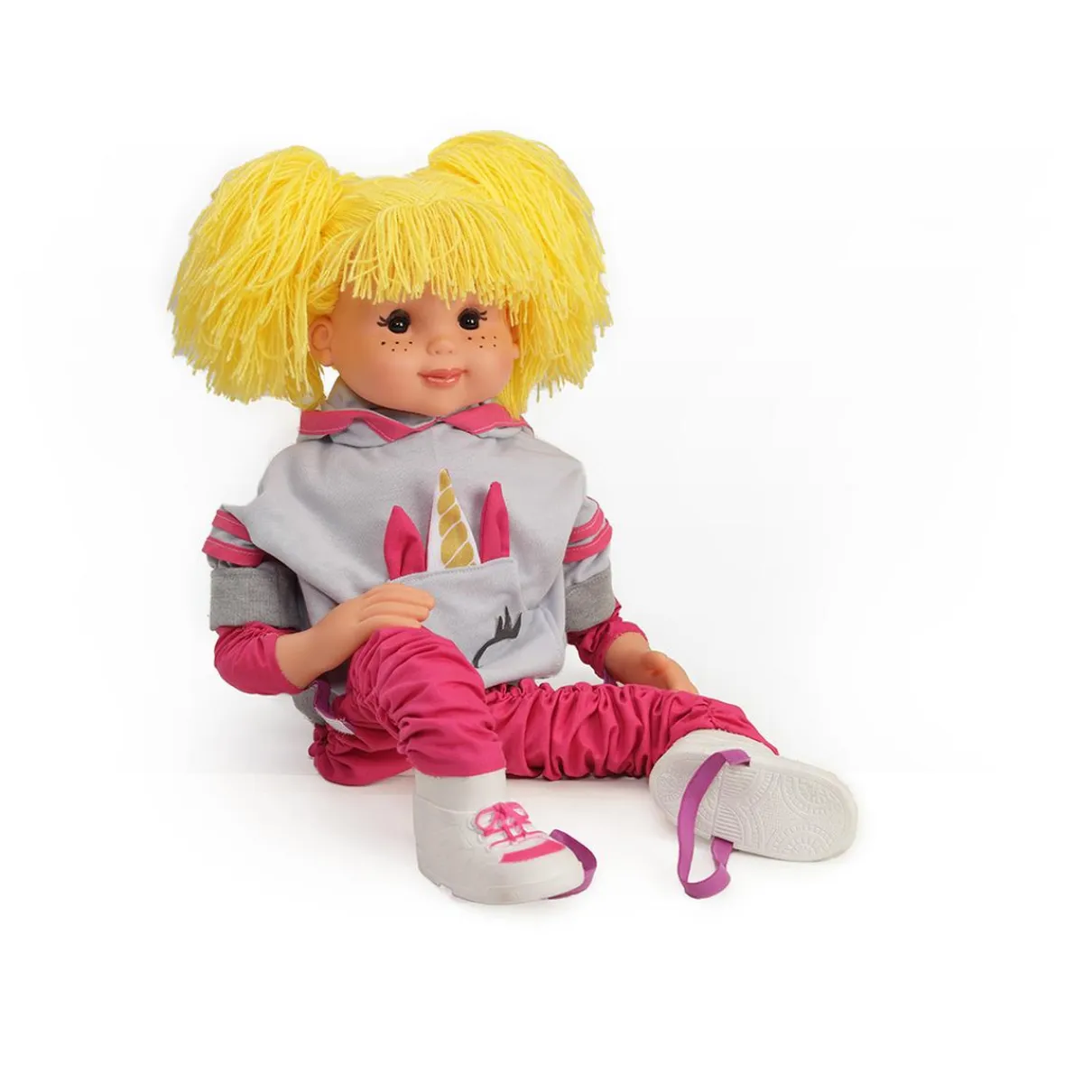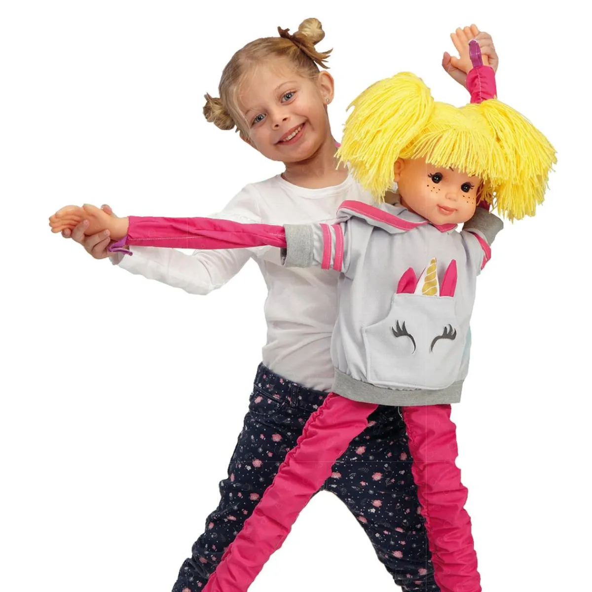 Penique es la muñeca con brazos y piernas elásticas. Tiene gomas a modo de anclajes en sus manos y piernas que hacen que realice los mismos movimientos que tú hagas. Tan solo únete a ella y comprueba cómo sus brazo y piernas se estiran reproduciendo todos tus movimientos. ¡Movimientos perfectamente sincronizados!