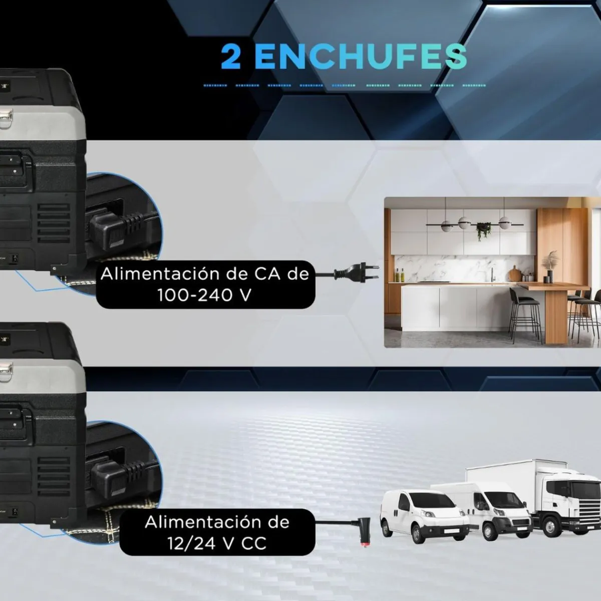 - Nevera de coche con 2 cables de alimentación, uno para el coche y otro para enchufar en la red eléctrica.