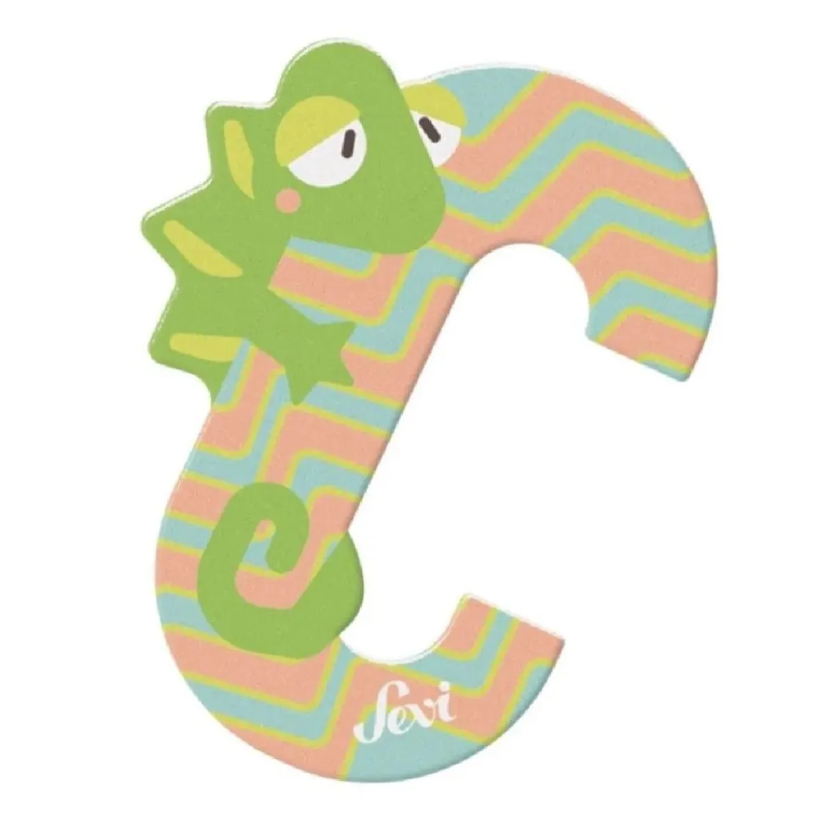 Fabricada en madera ligera, esta letra está pintada a mano con colores suaves y vivos. Cada letra de la serie representa la inicial de un animal; en este caso, la ‘C’ está asociada al camaleón, introduciendo a los niños en el mundo animal mientras aprenden a reconocer letras y sonidos.