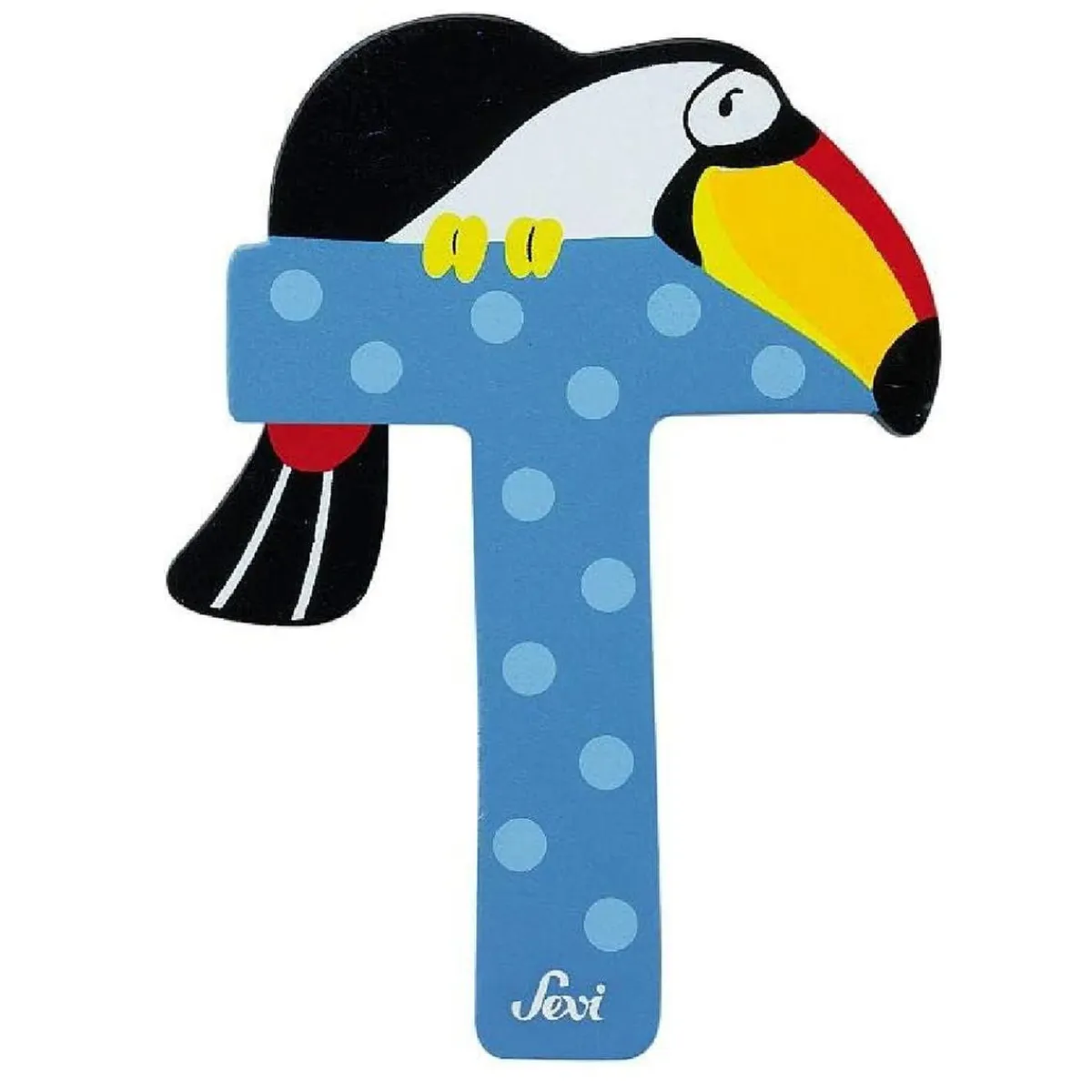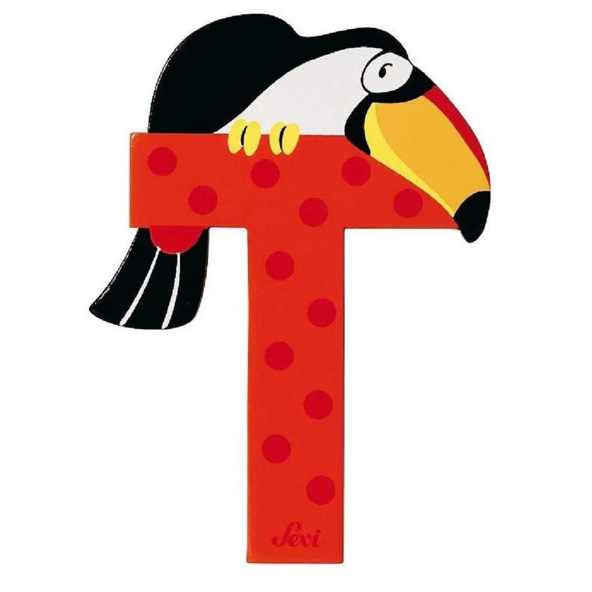 La Letra T de madera de Sevi presenta un diseño atractivo con la figura de un tucán, perfecta para decorar y enseñar el alfabeto.
