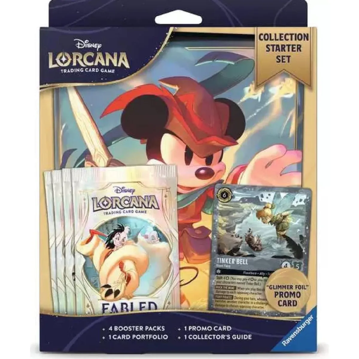 El Set de Inicio de Disney Lorcana es un set diseñado para que los jugadores se adentren de manera completa en el universo mágico de Lorcana. Incluye 4 sobres de refuerzo de la expansión Fabled, un portafolio de 4 bolsillos para almacenar cartas, una carta promocional de Tinker Bell – Giant Fairy con acabado «Glimmer Foil» y una guía para coleccionistas. Este conjunto inicial permite explorar los personajes más emblemáticos de Disney a través de cartas únicas, cada una con ilustraciones detalladas y habilidades especiales que reflejan la esencia de los personajes y su historia dentro del mundo Lorcana.