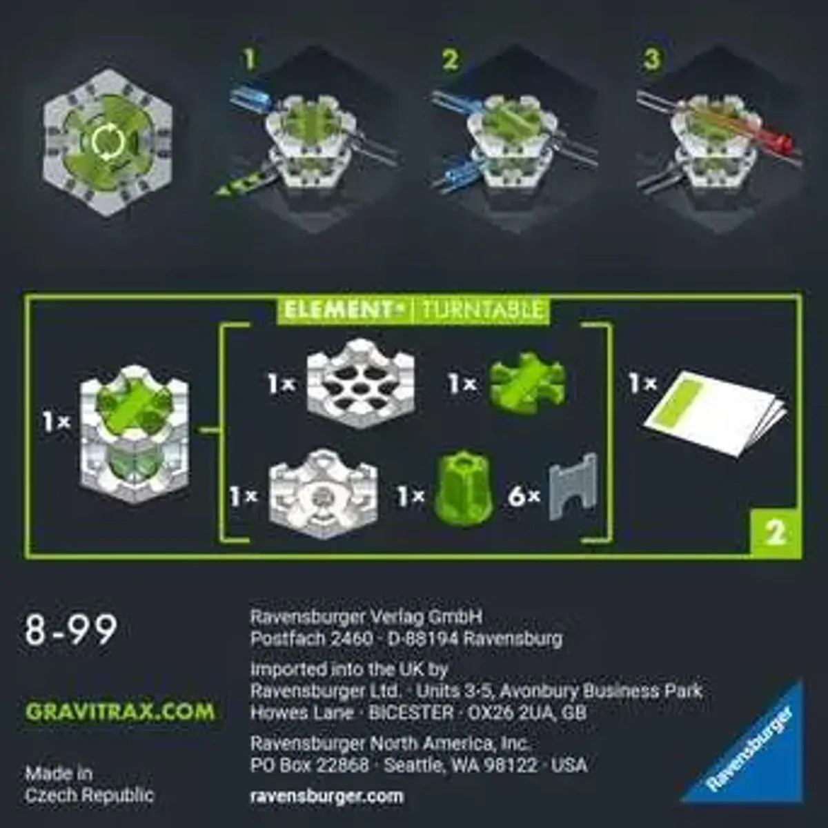 El Plato Giratorio Element de la serie PRO de GraviTrax es un plato giratorio mecánico que gira a medida que las canicas ruedan hacia abajo a través de la piedra. No sólo cambia de dirección, sino que también gira la plataforma. Esta característica permite un mayor control sobre los caminos de las canicasm y amplía las posibilidades de variación y dirección de las mismas.